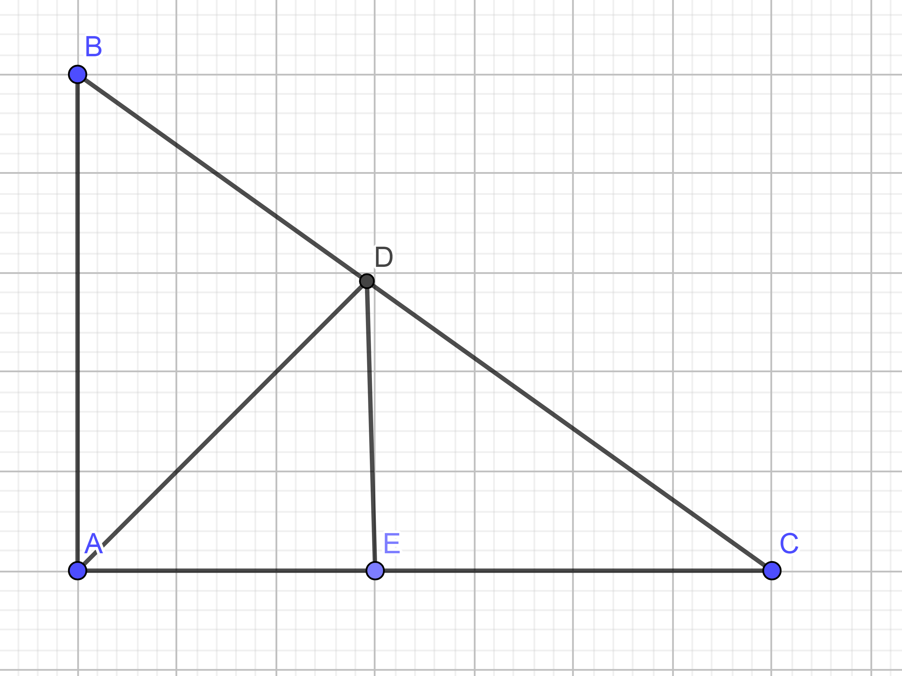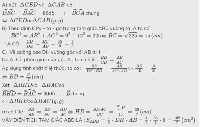cho tam giác ABC vuông tại A biết AB=9cm, AC=12cm. Tia phân giác của góc BAC cắt cạnh BC tại D. Từ D kẻ đường vuông góc với AC, đường thẳng này cắt AC tại E