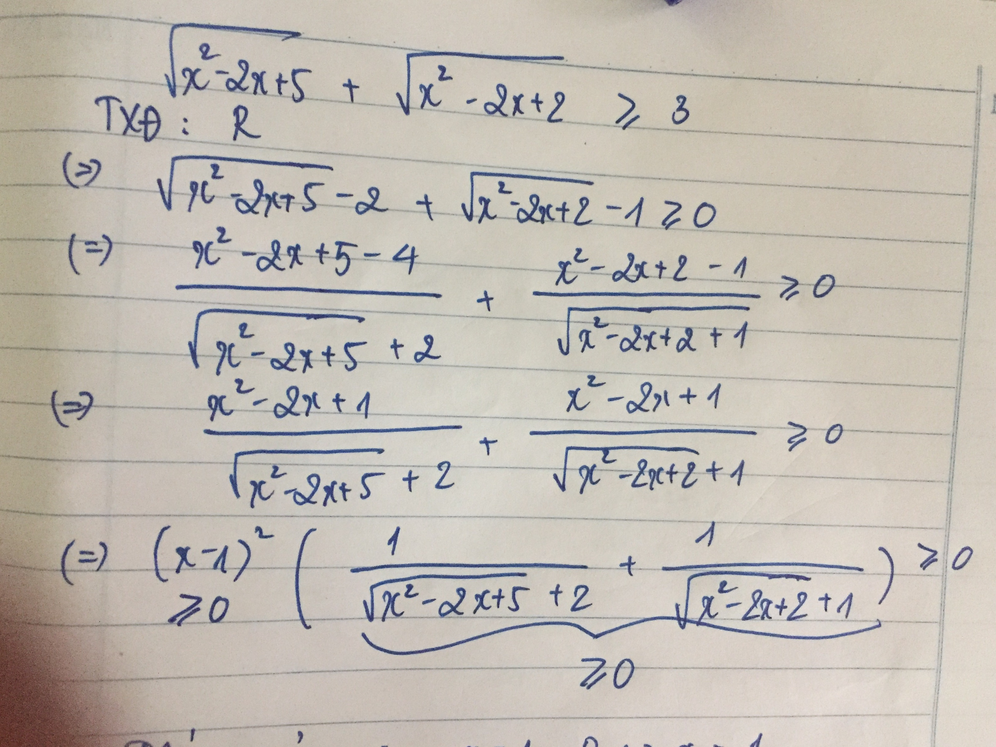 $\sqrt{x^{2}- 2x + 5}$ + $\sqrt{x^{2} - 2x + 2}$ $\geq$ 3