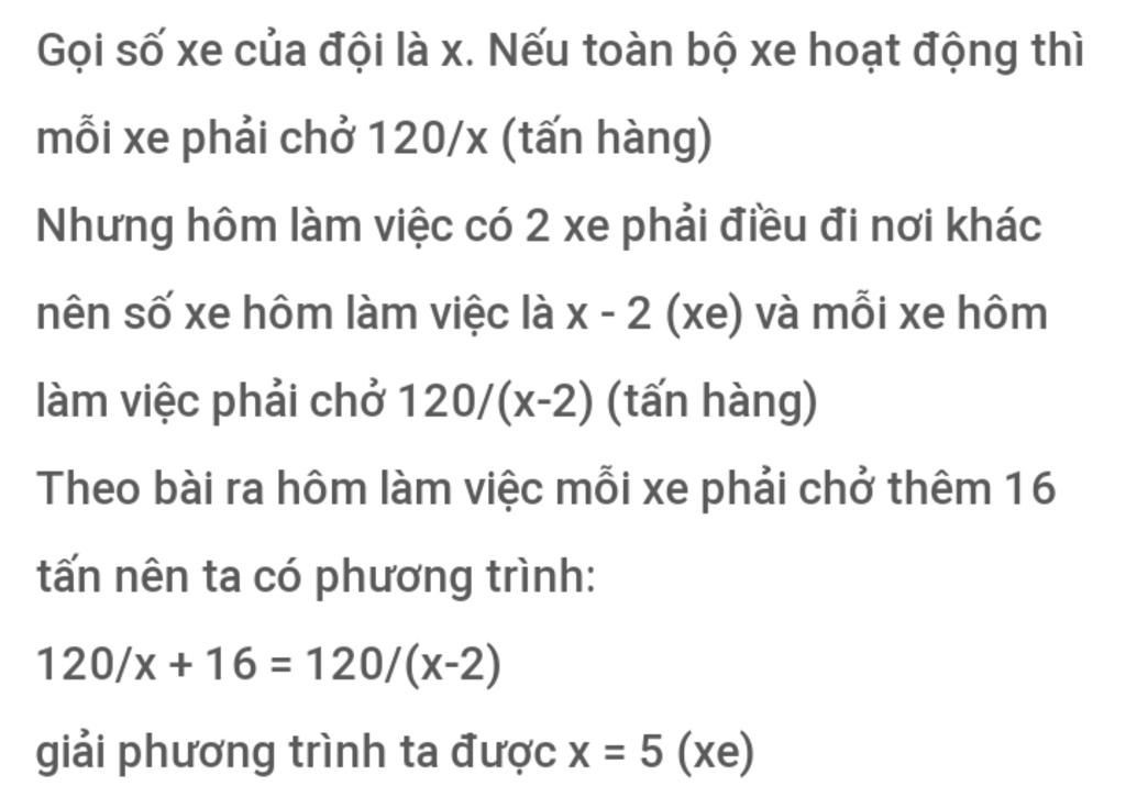 1 đội xe cần chuyên chở 120 tấn hàng. Hôm lm việc có 2 xe phải điều đi nơi khác nên mỗi chiếc xe còn lại phải trở thêm 16 tấn. Hỏi đội xe có bao nhiêu xe?