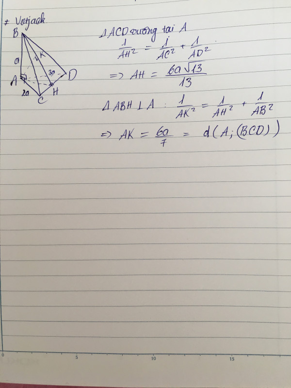cho tứ diện ABCD có 3 góc vuông tại A, AB=a, AC=2a, AD=3a. tính khoảng cách từ A đến (BCD)?