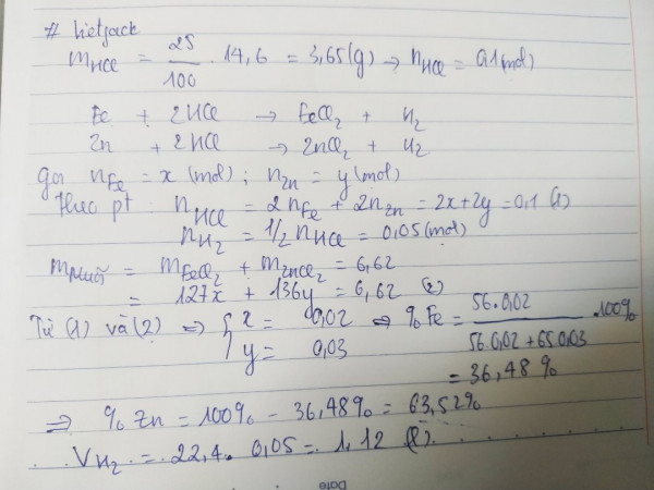 Cho hỗn hợp Fe và Zn tác dụng vừa đủ 14,6 g dụng dịch HCL 25% thì thu được 6,62 g muối khan