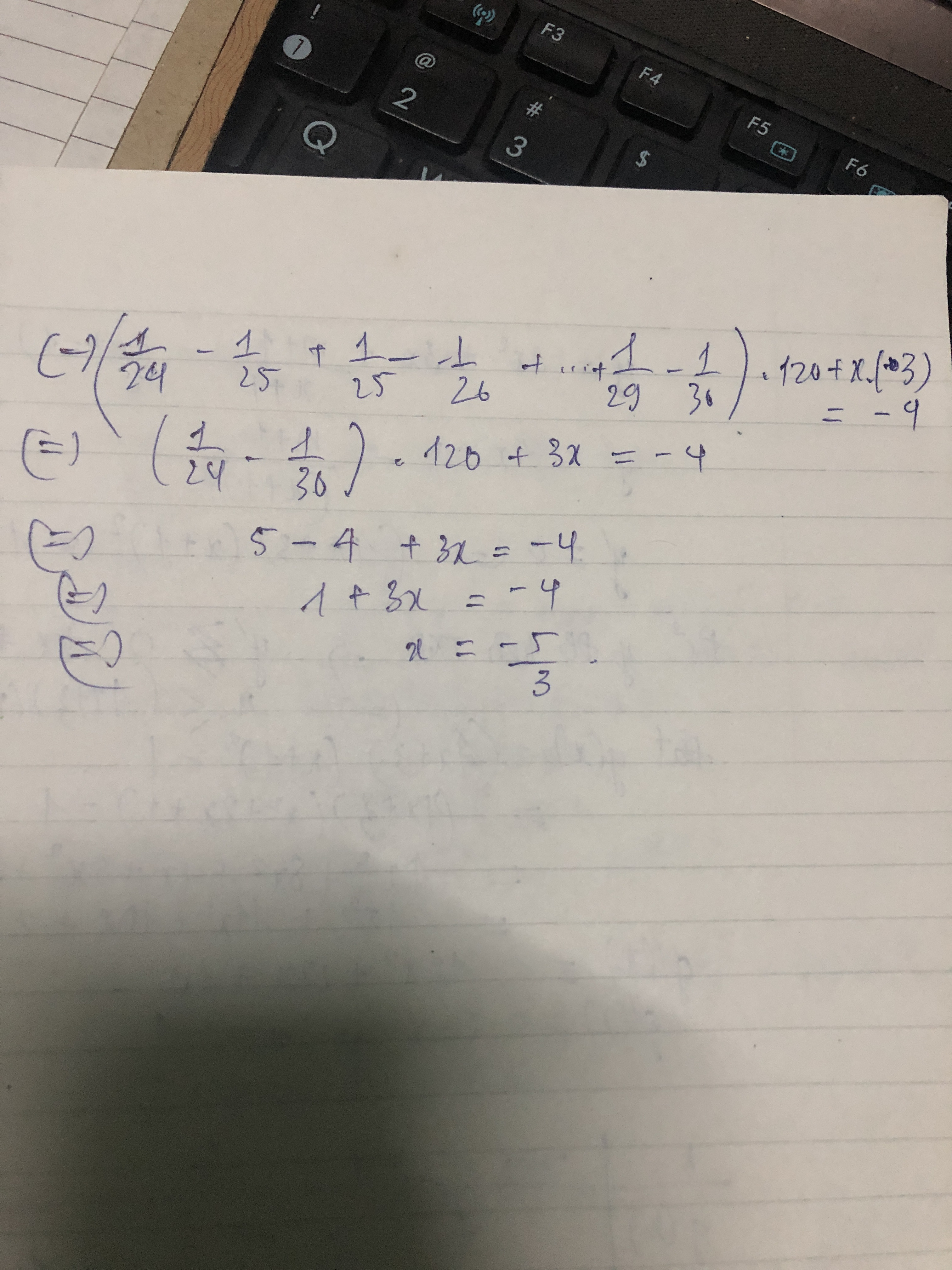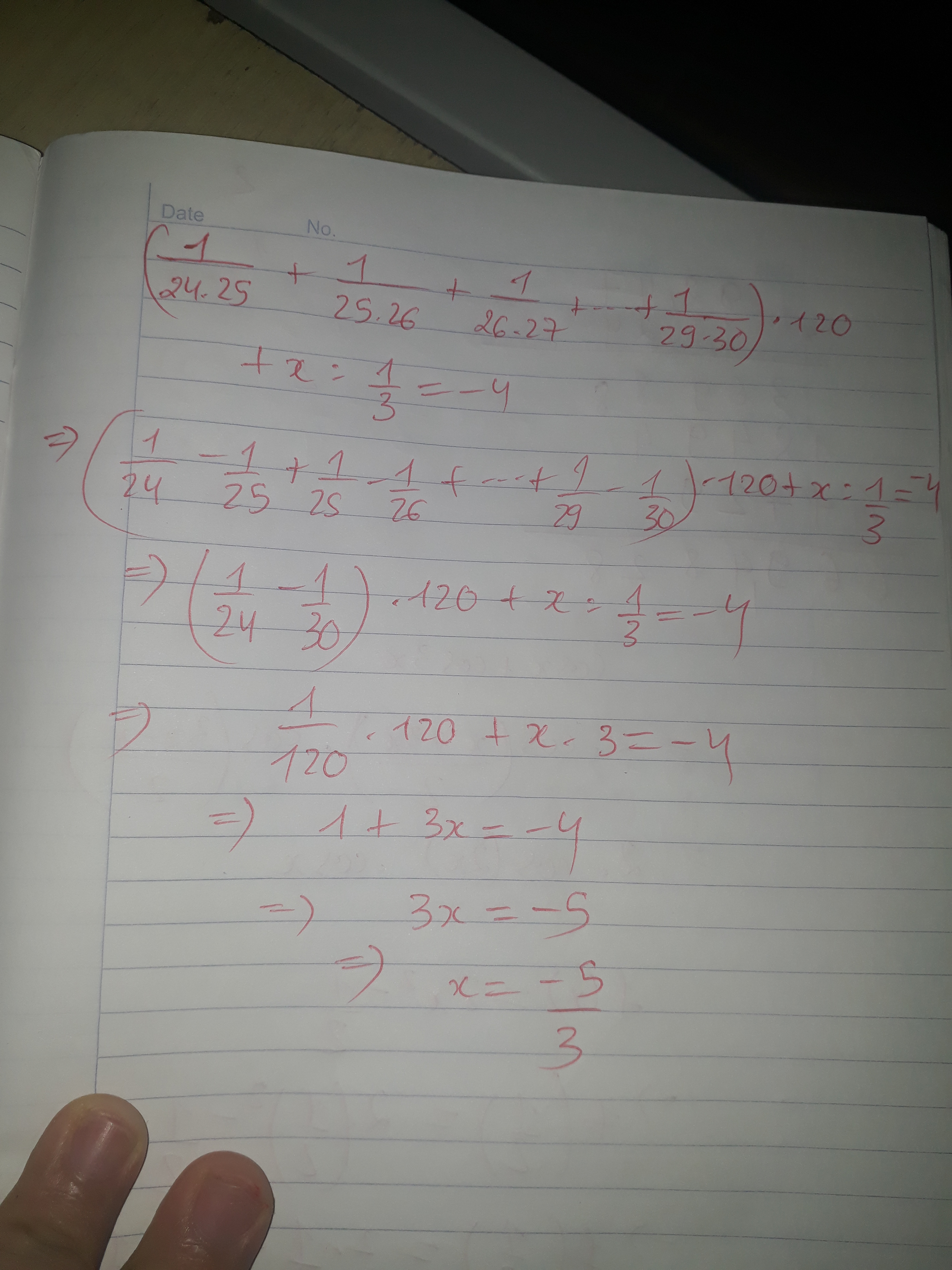 (1/24.25 + 1/25.26 +.......+ 1/29.30) . 120 + X : 1/3= -4