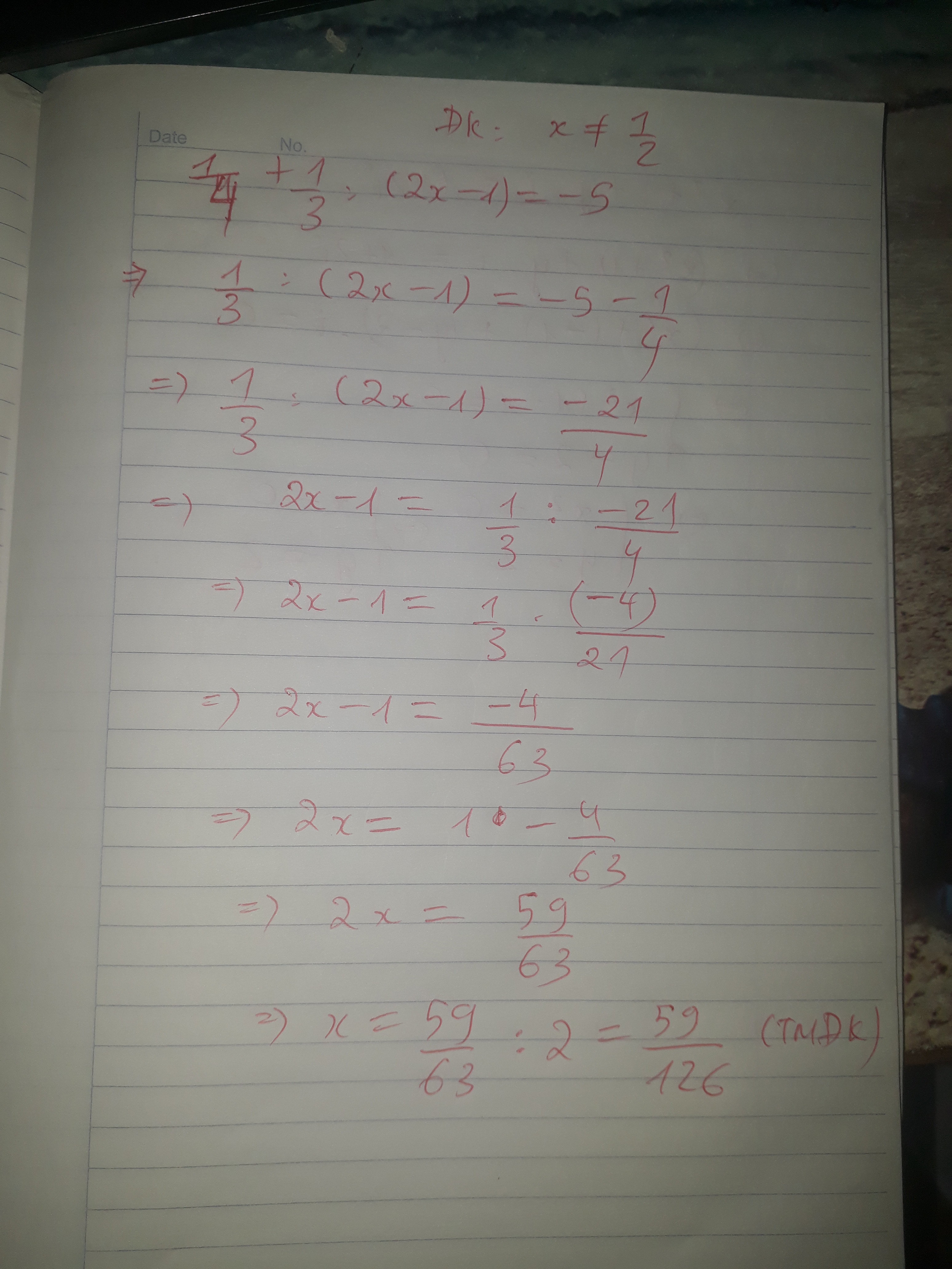 1/4+1/3:(2X-1)=-5 =>1/3:(2x-1)=-5-1/4 =>1/3:(2x-1)=-21/4 =>2x-1=(1/3):(-21/4) =>2x-1=-4/63 =>2x=59/63 =>x=59/126