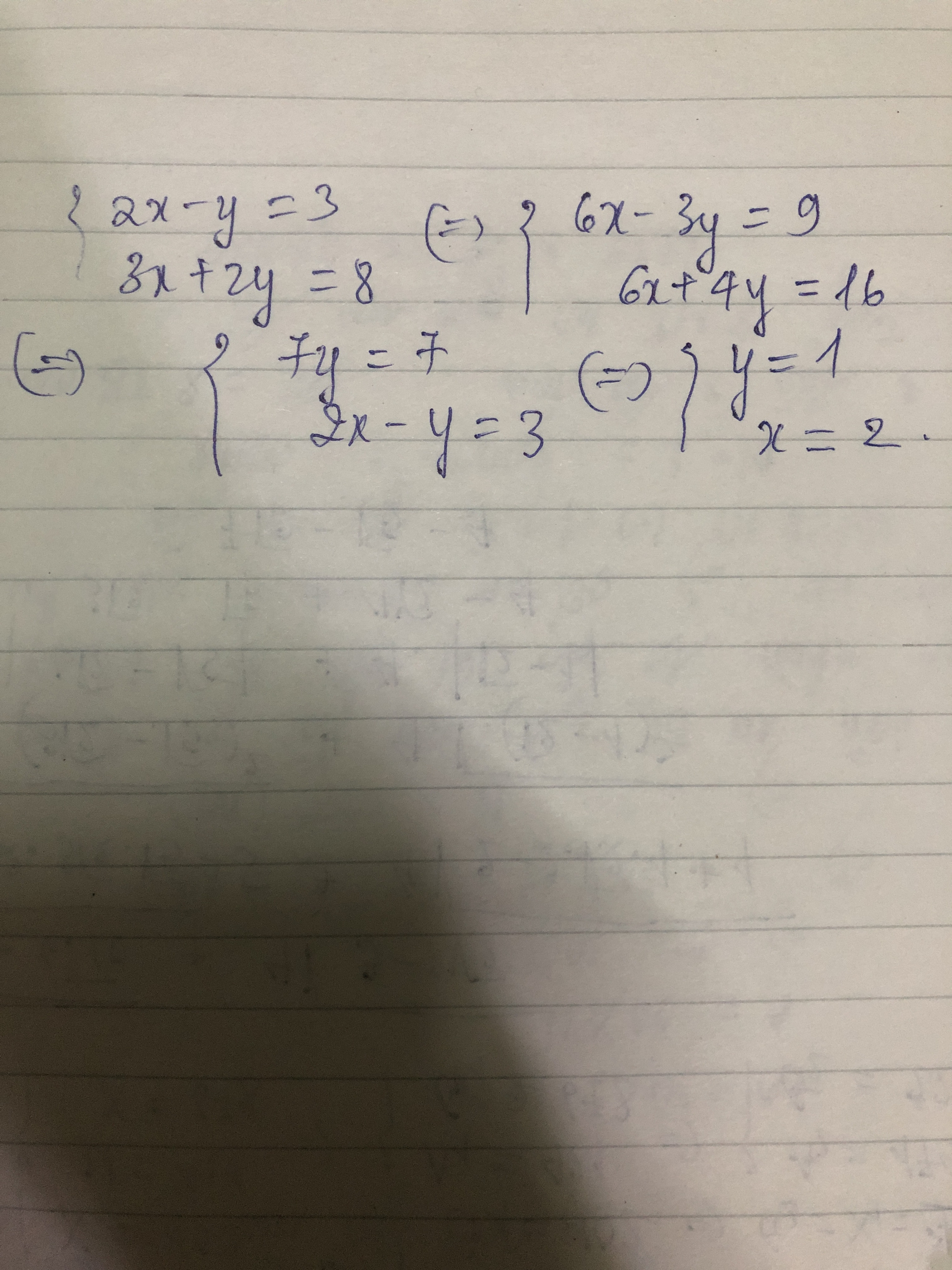 Giải phương trình 2x-y=3 và 3x+2y=8