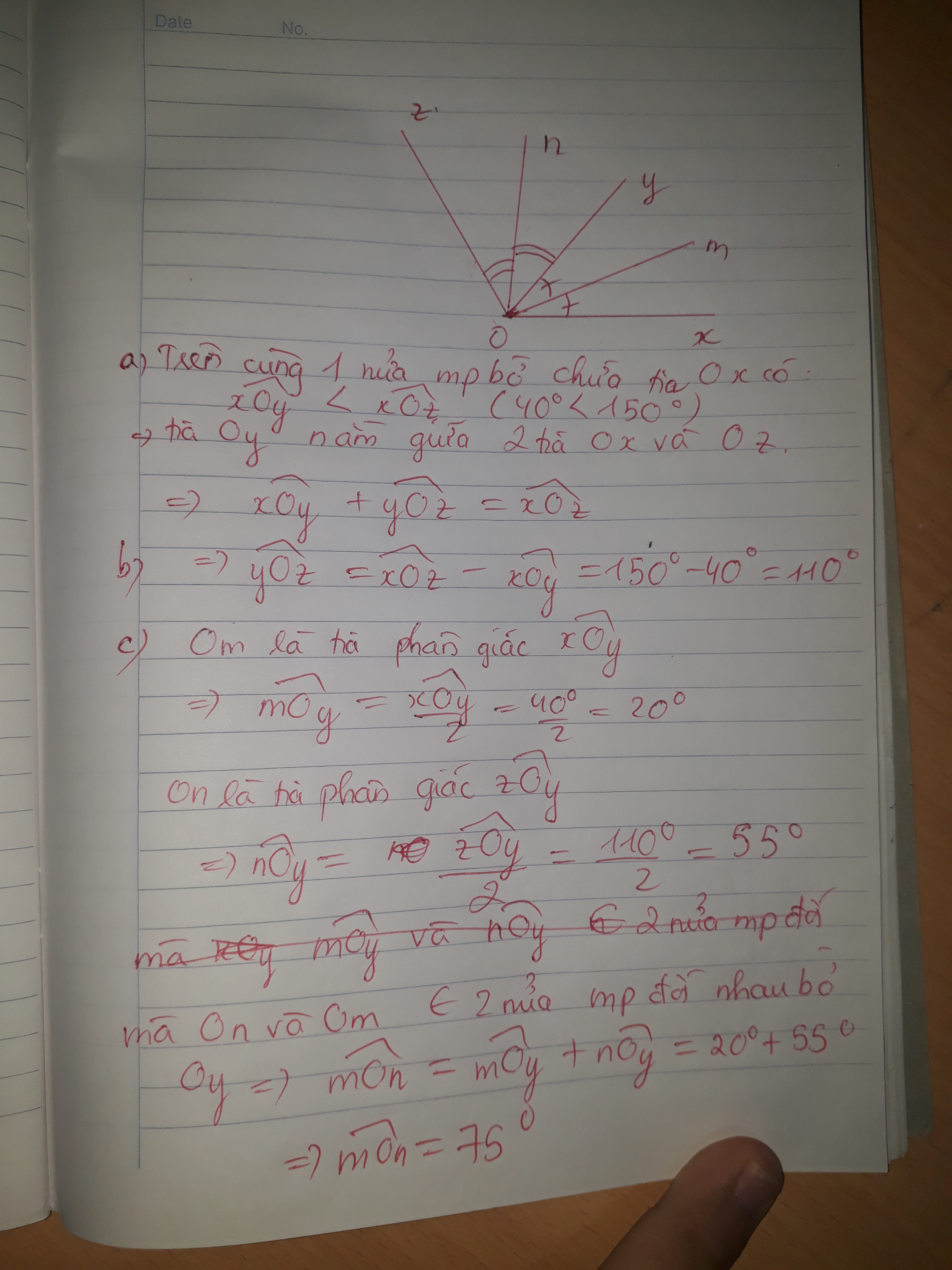 c) Vẽ tia phân giác Om của góc xOy, vẽ tia phân giác On của góc yOz. Tính số đo góc mOn.