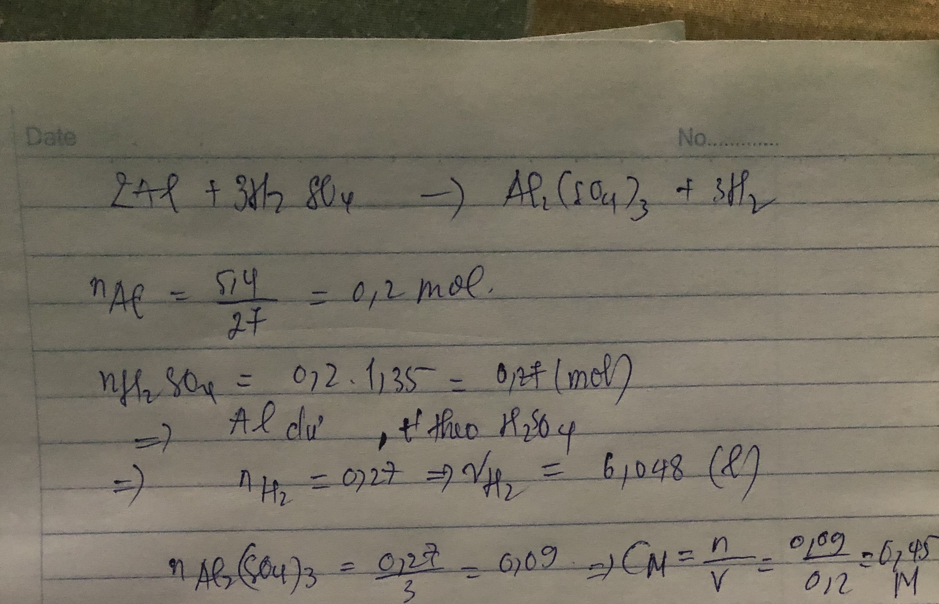 Cho 5,4g nhôm vào 200ml dung dịch H2SO4 1,35M.