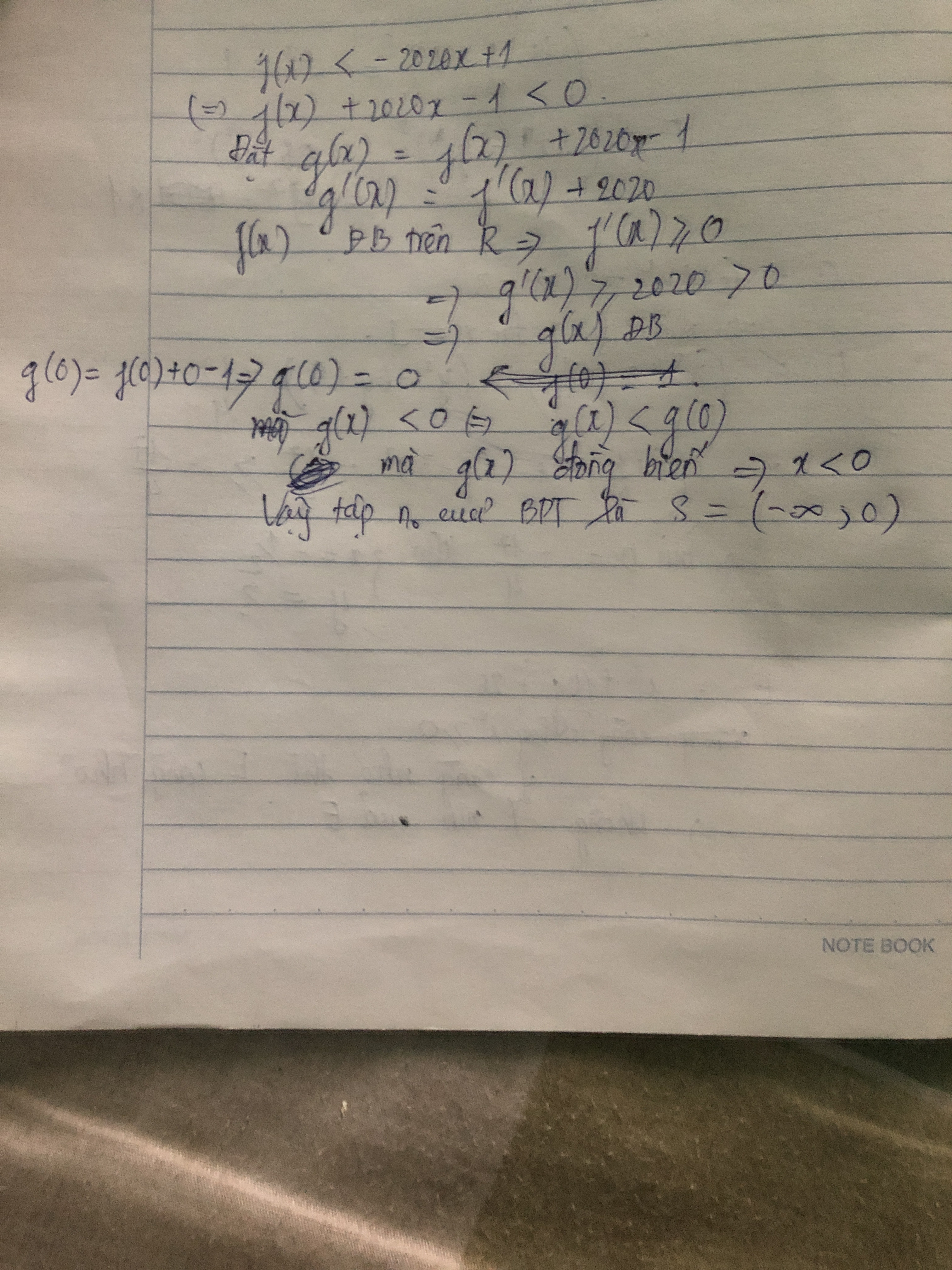 Cho hàm số f(x) xác định và đồng biến trên R. Biết f(0)=1, tập nghiệm của bất phường trình f(x)<-2020x+1 là?