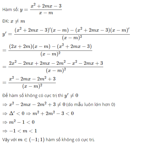 Tìm tập hợp tất cả các giá trị của tham số m để hàm số: y bằng (x mũ 2+2mx-3) /x-m không có cực trị