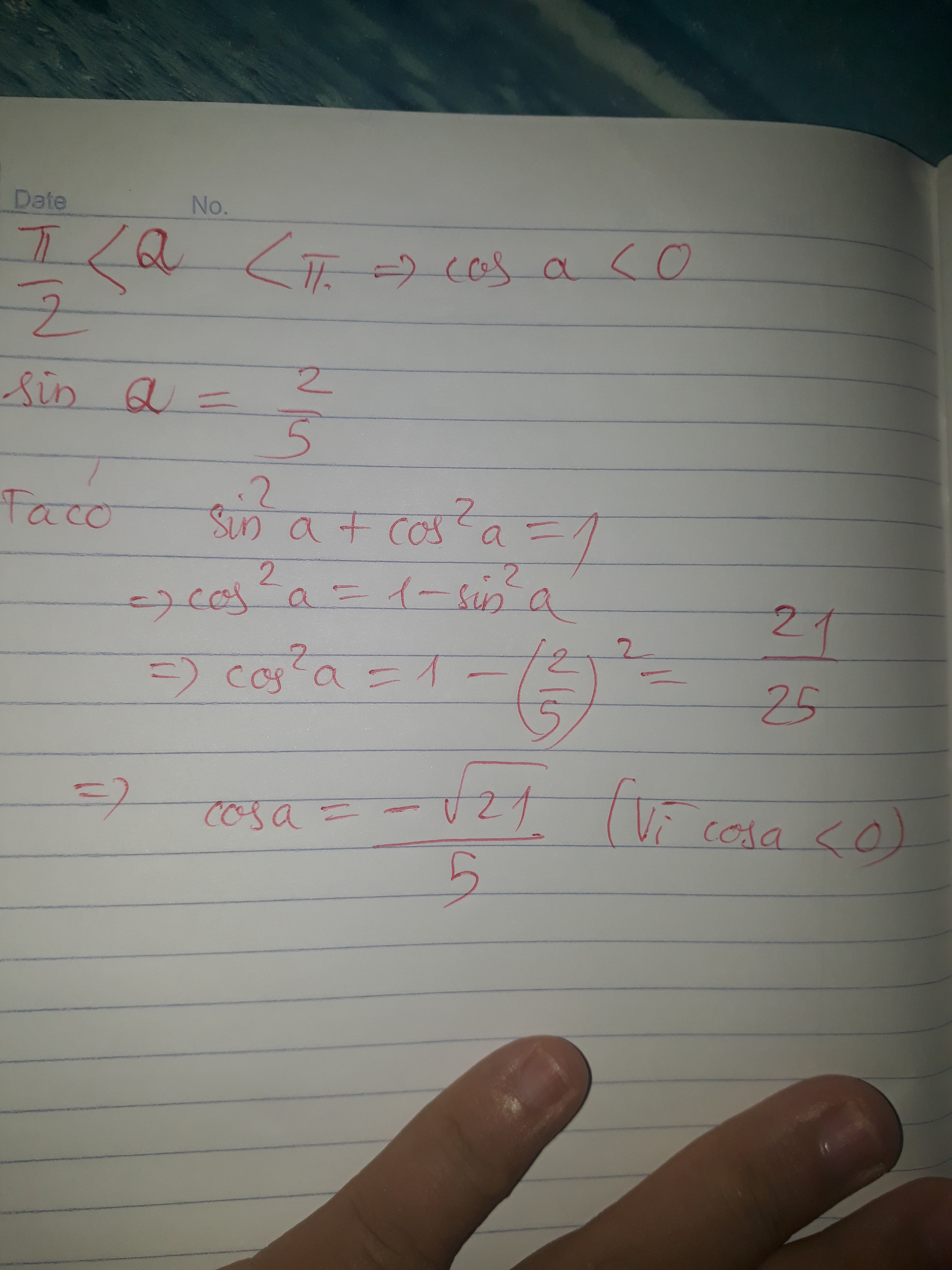 Cho sina=2/5 và góc a thoả mãn pi/2<a<pi khi đó cosa=?
