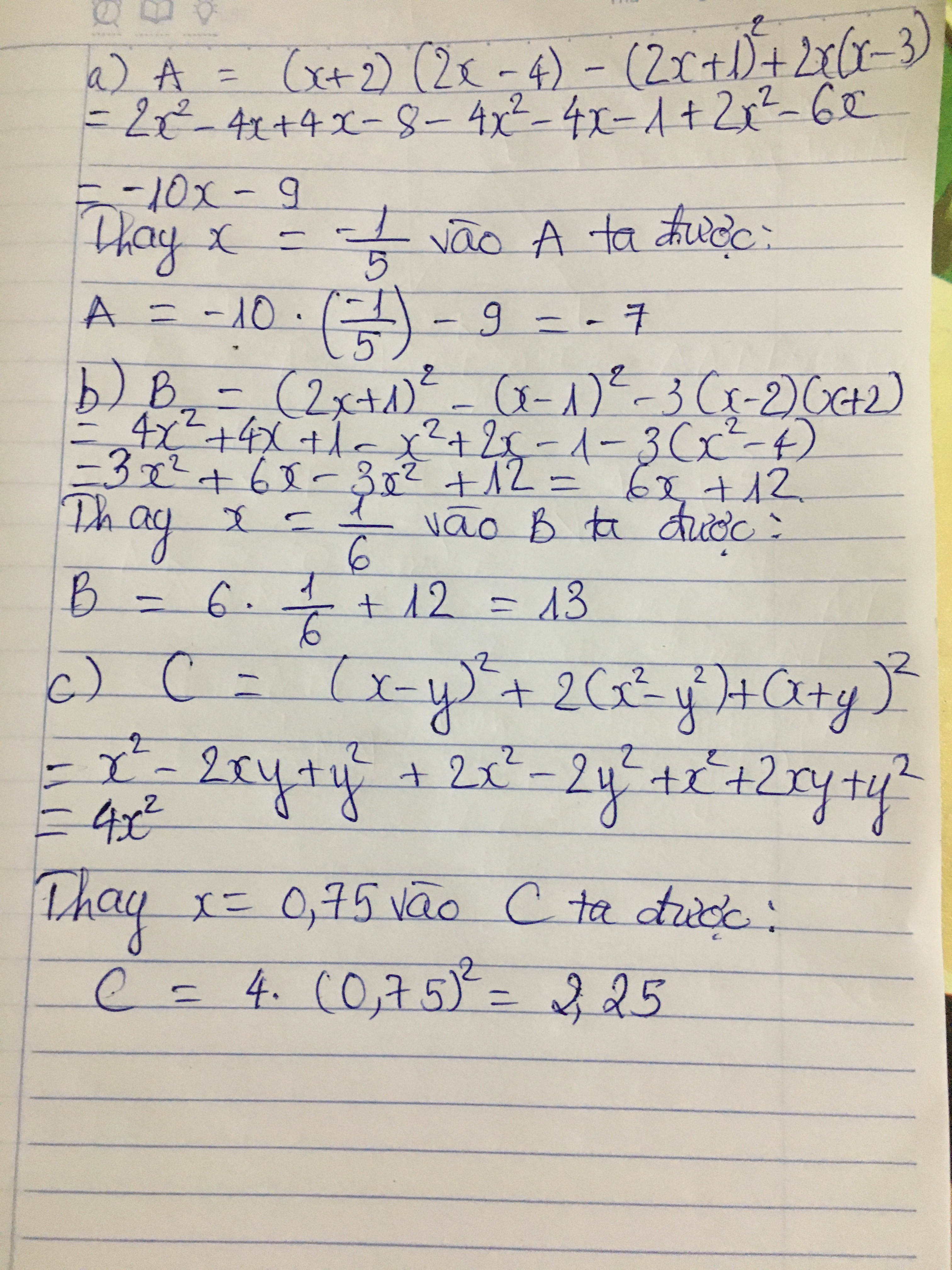 c) C= (x-y)²+2(x²-y²)+(x+y)² với x=0,75