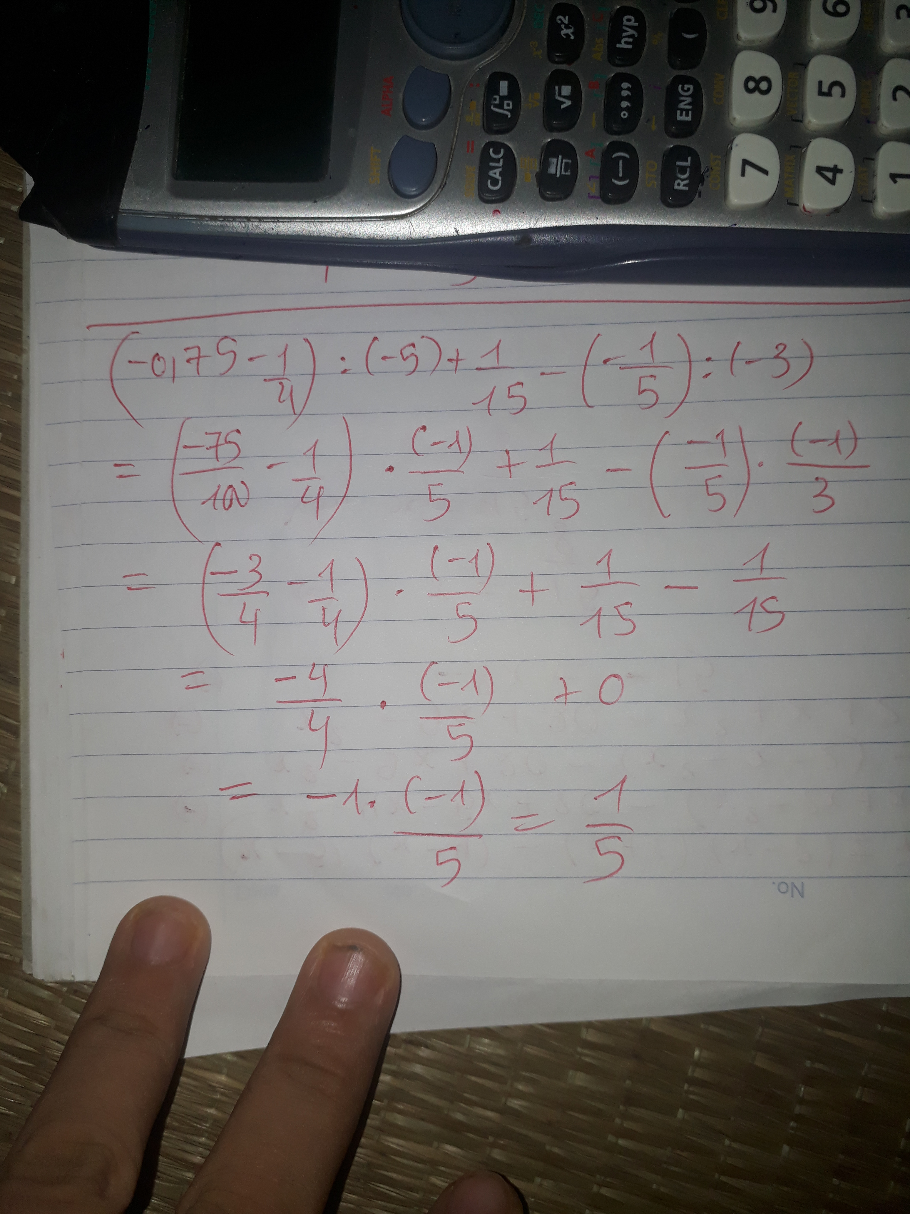 (-0,75-1/4) : (-5) + 1/15 -(-1/5) : (-3)