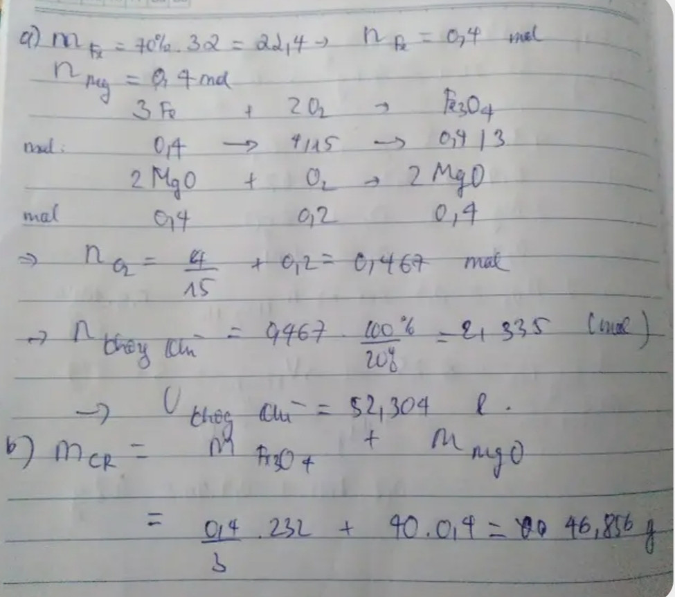 Đốt cháy hoàn toàn 32g hỗn hợp gồm Fe và Mg (trong đó Fe chiếm 70%). Hãy tính: