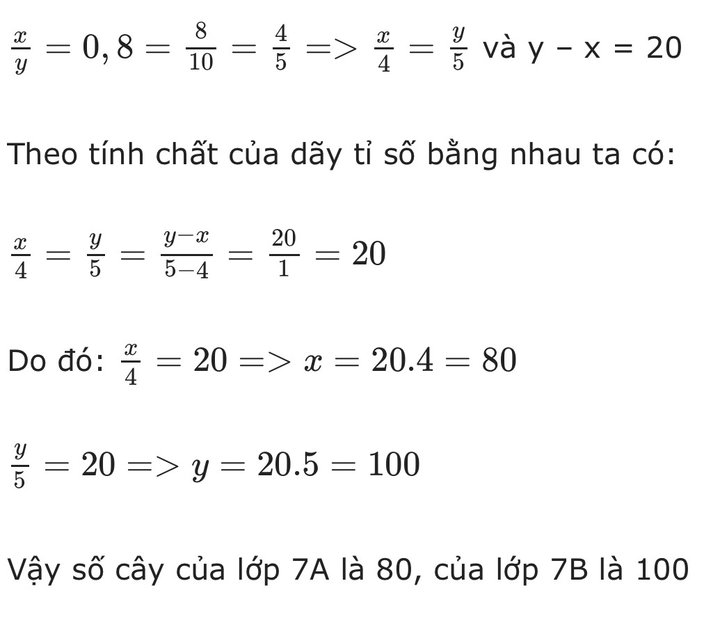 Gọi x, y lần lượt là số cây trồng được của lớp 7A, 7B. Theo đề bài ta có: