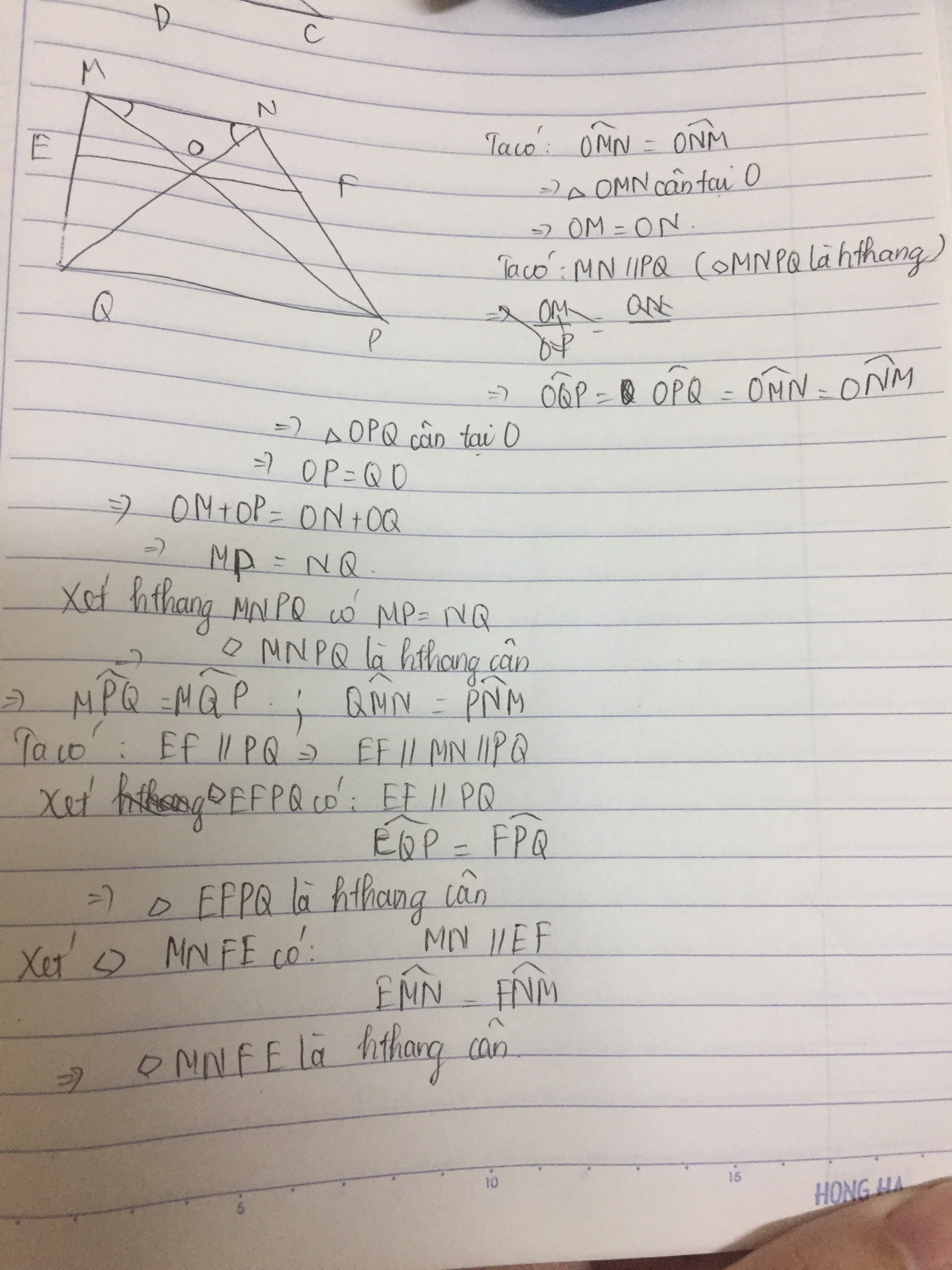 Cho hình thang MNPQ ( MN là đáy nhỏ) có 2 đường chéo MP và NQ cắt nhau tại O và góc NMP= góc MNQ. Qua O vẽ đường thẳng EF//QP (E thuộc MQ, F thuộc NP). CMR: MNPQ, MNEF, FEQP là các hình thang cân.