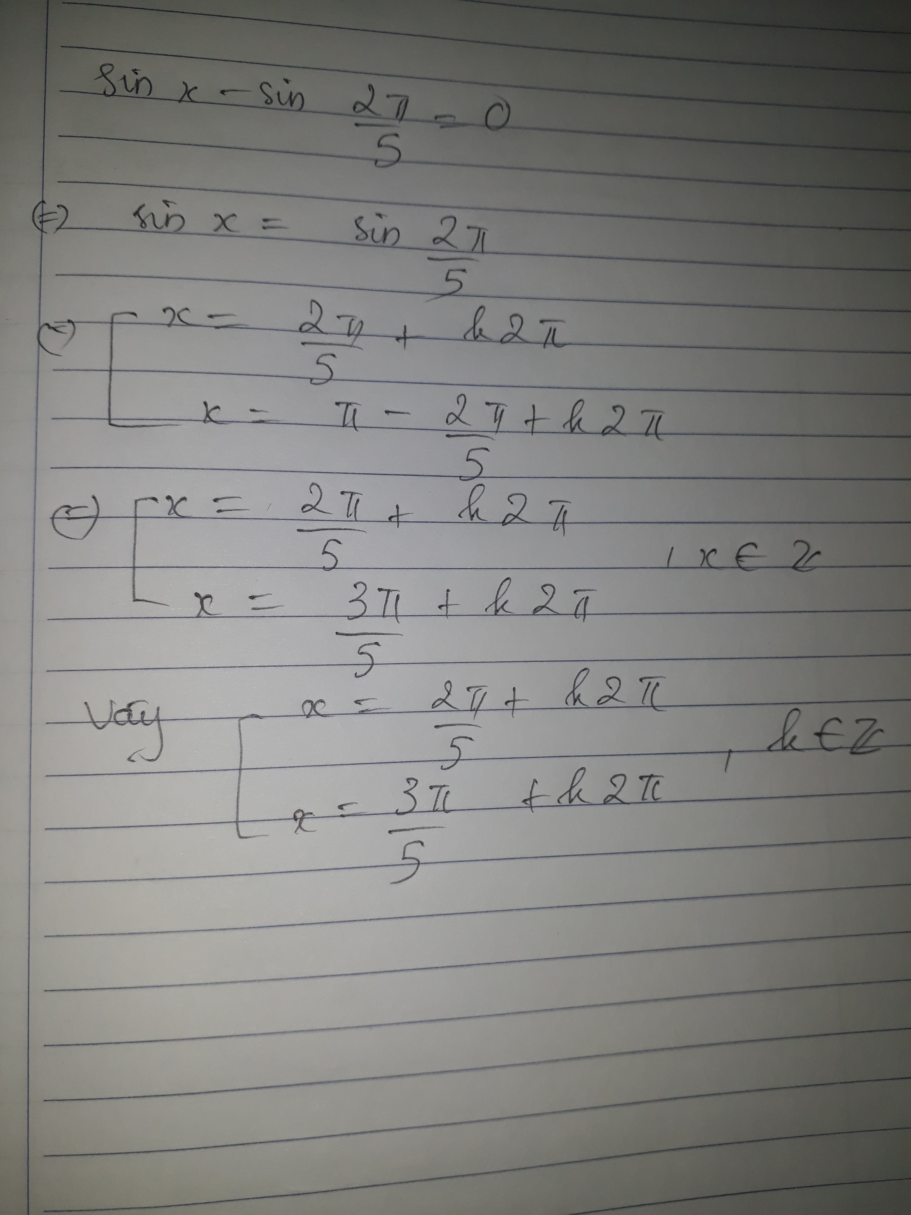 ⇔sinx=sin2π5⇔x=2π5+k2π, k∈Z hoặc x=3π5+k2π, k∈Z Vậy pt đã cho có nghiệm là:x=2π5+k2π, k∈Z hoặc x=3π5+k2π, k∈Z