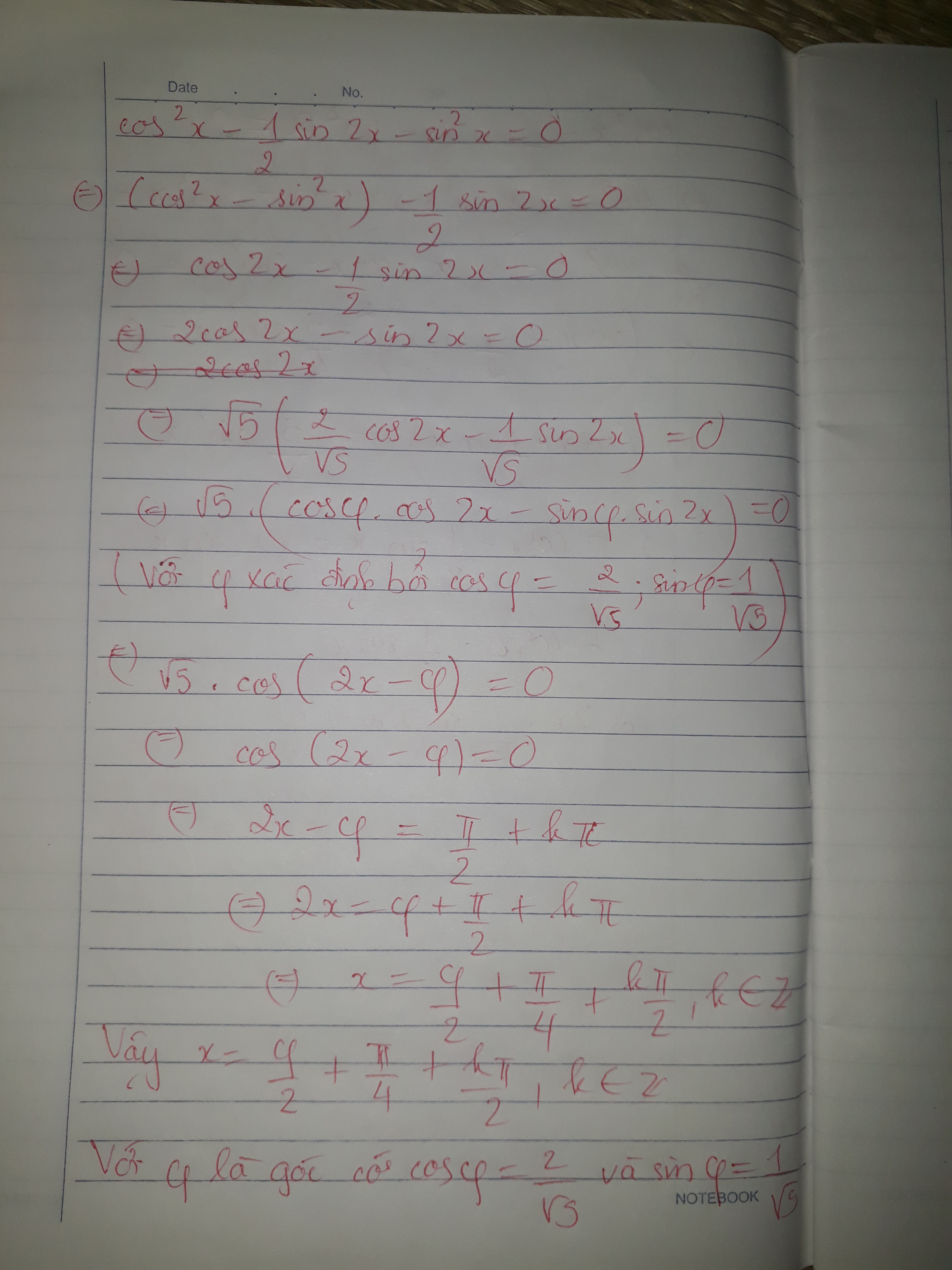 Cos^2x - 1/2sin2x - sin^2x = 0