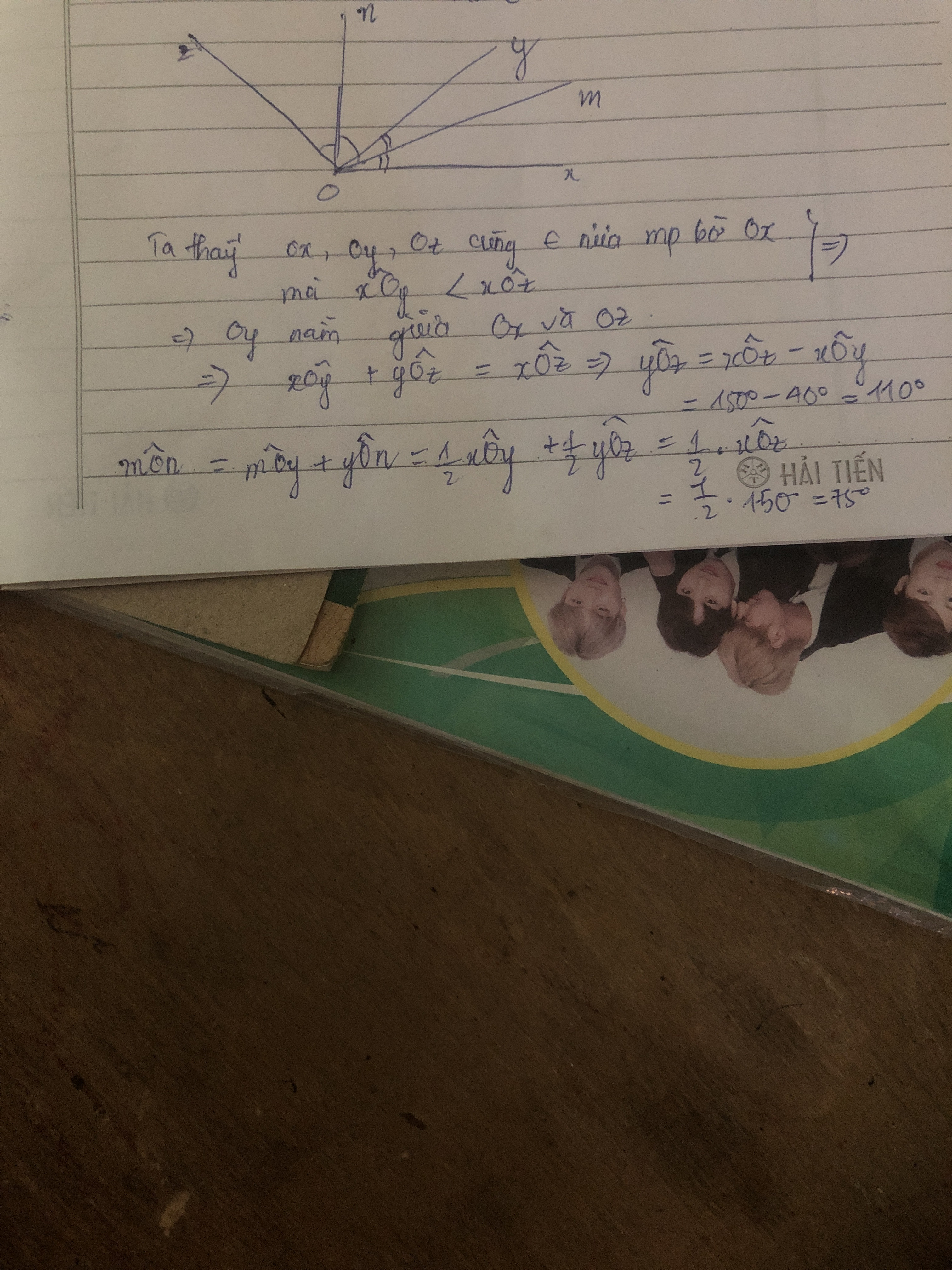 Bài 4 : Cho hai tia Oy và Oz cùng nằm trên nửa mặt phẳng bờ chứa tia Ox , biết XOy =40° , XOz: = 150° a ) Trong ba tia Ox , Oy , Oz tia nào nằm giữa hai tia còn lại ? Vì sao ? b ) Tính yOz : ? c ) Vẽ tia phân giác Om của xOy, vẽ tia phân giác On của yOz?Tính số đo mOn