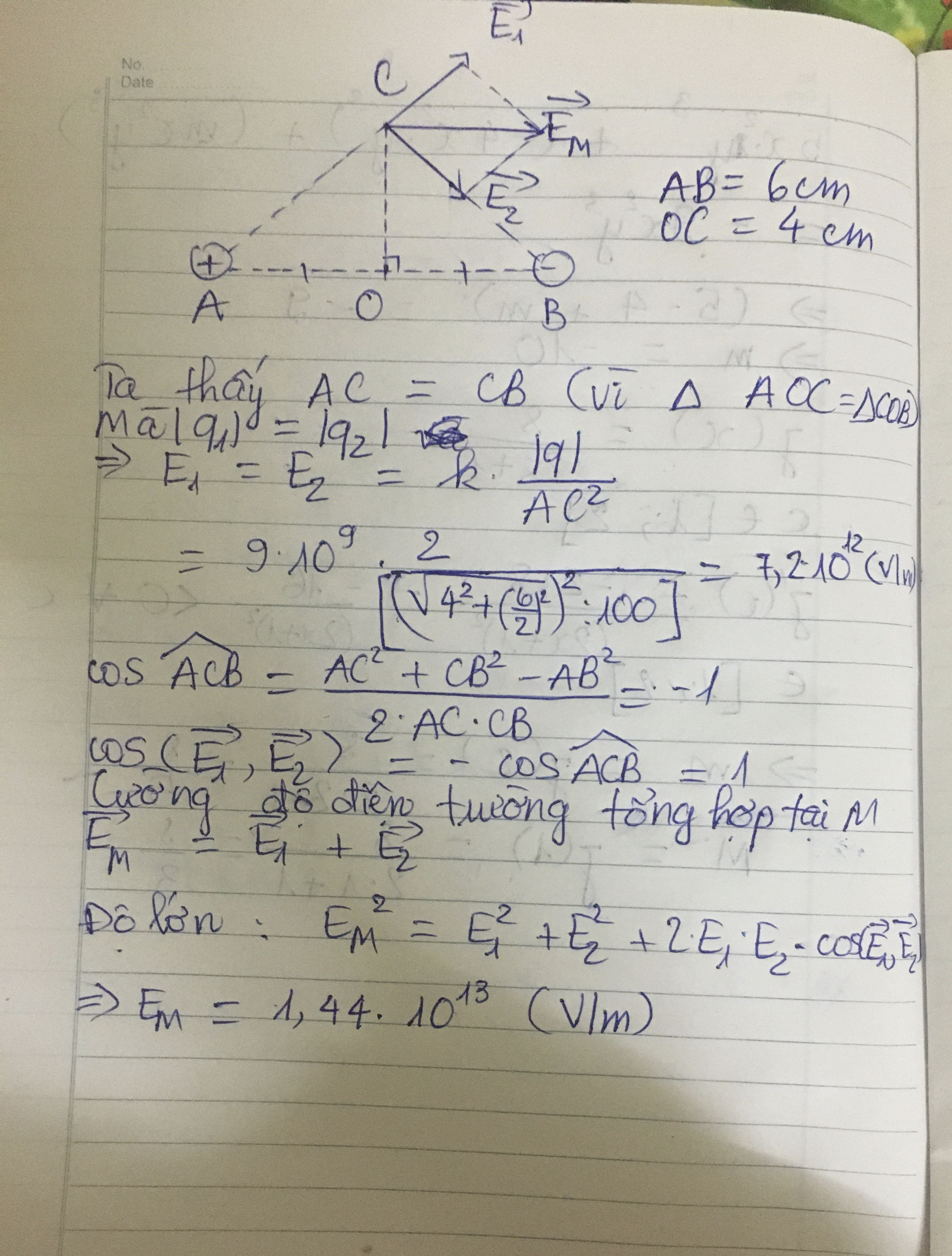 hai điện tích điểm q1= 2 và q2= -2 đặt tại A và B cách nhau một khoảng cách AB=6cm. Cường độ điện trường tổng hợp tại điểm C nằm trên đường trung trực ccuar AB và AB 1 khoảng x =4 cm có độ lớn gần bằng