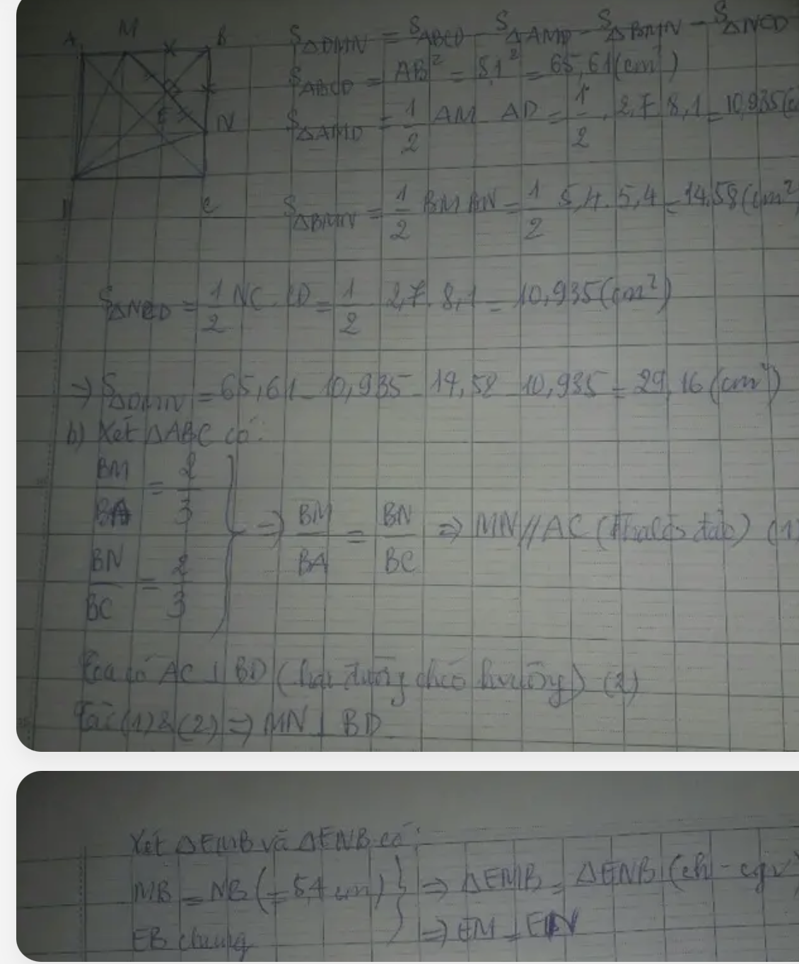 Cho hình vuông ABCD cạnh bằng 8,1cm. Trên AB lấy điểm M, sao cho AM = 1/3 AB. Trên BC lấy điểm N, sao cho BN = 2/3 BC.