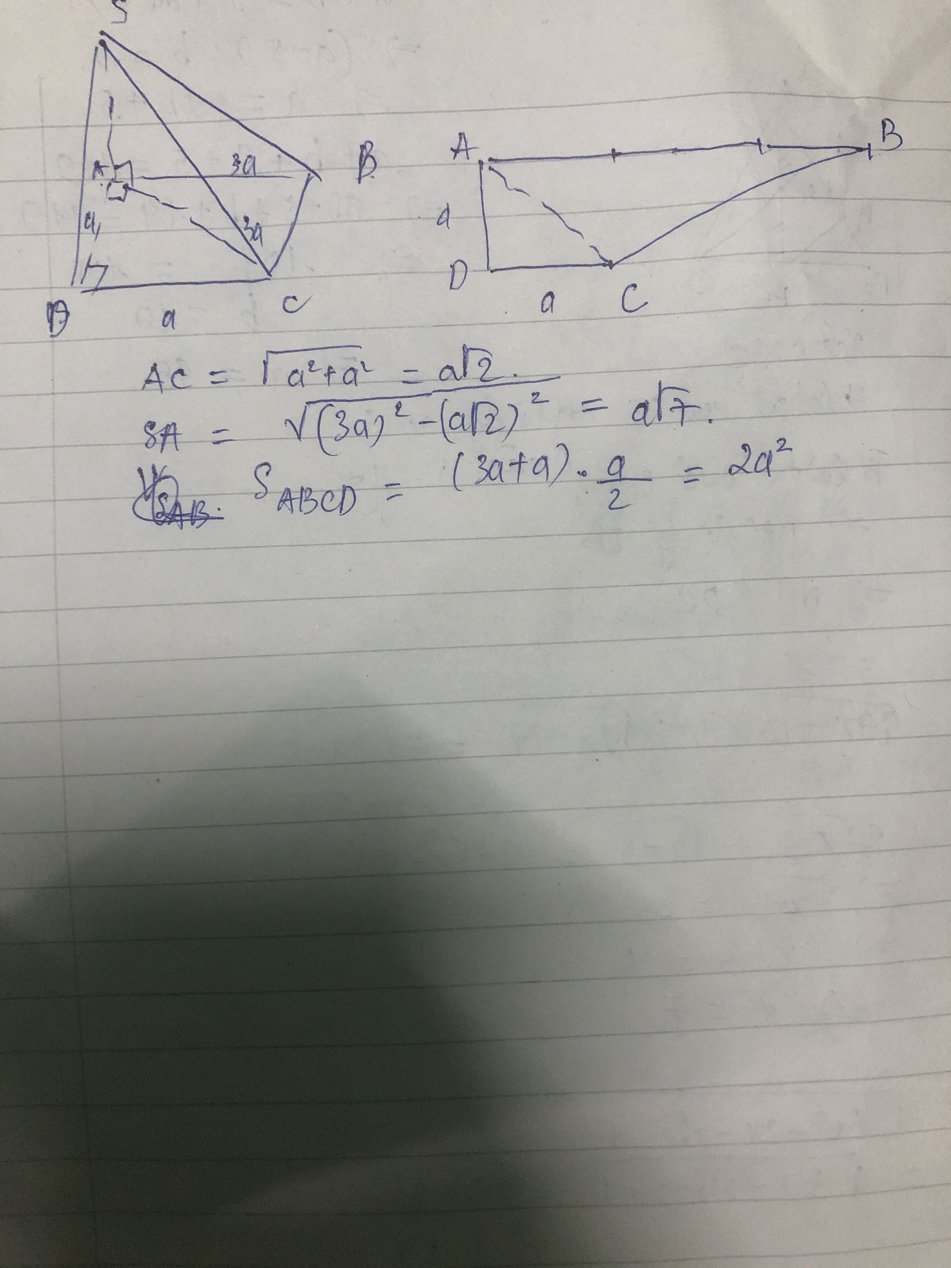 Cho hình chóp S.ABCD có đáy là hình thang vuông tại A và D, AD=DC=a, AB=3a. Cạnh bên SA vuông góc với đáy và SC=3a. Tính diện tích hình thang vuông và đường cao hình chóp.