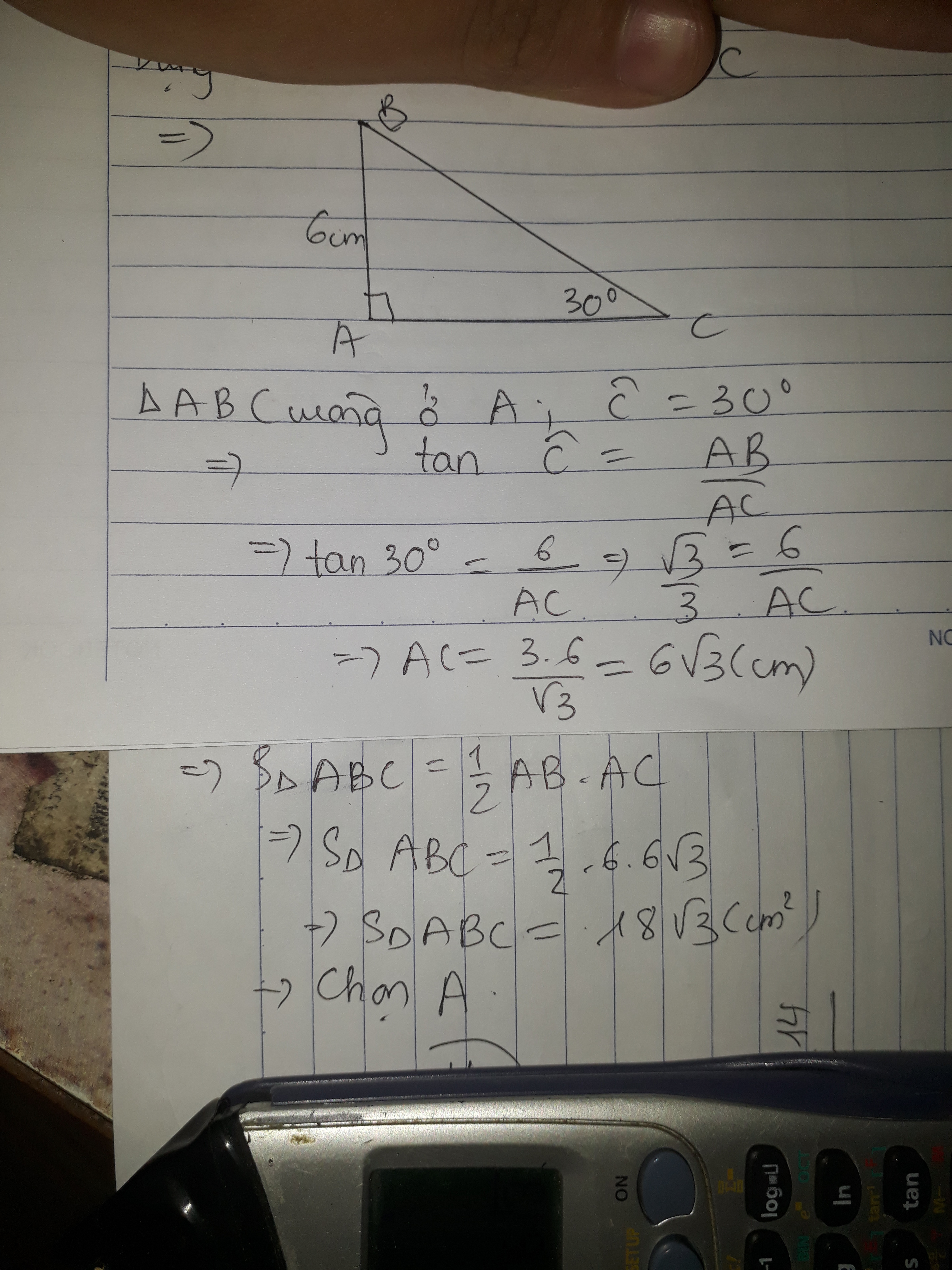 Tam giác vuông có một góc nhọn 30 độ, cạnh góc vuông đối diện với góc nhọn bằng 6 cm . Thì diện tích bằng