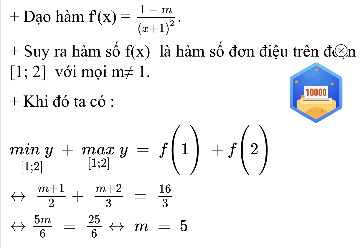Cho hàm số: y bằng (x+m) /x+1 (m là tham số thực ) thoả mãn min y[1, 2] +max y[1, 2] bằng 16/3