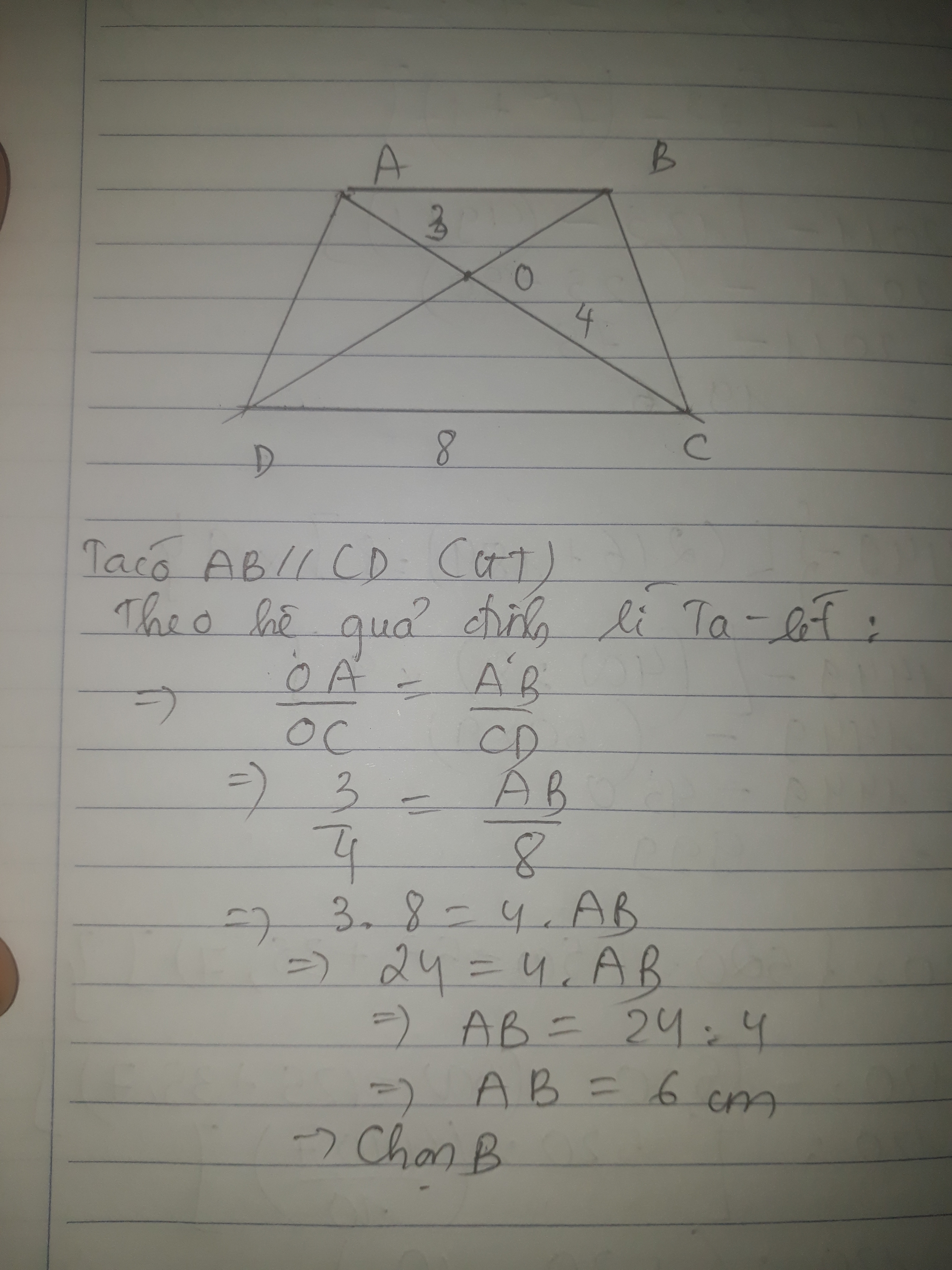 Hình thang ABCD ( ab// cd ) có OA = 3 cm Oc = 4 cm CD = 8 cm . Thì độ dài cạnh AB