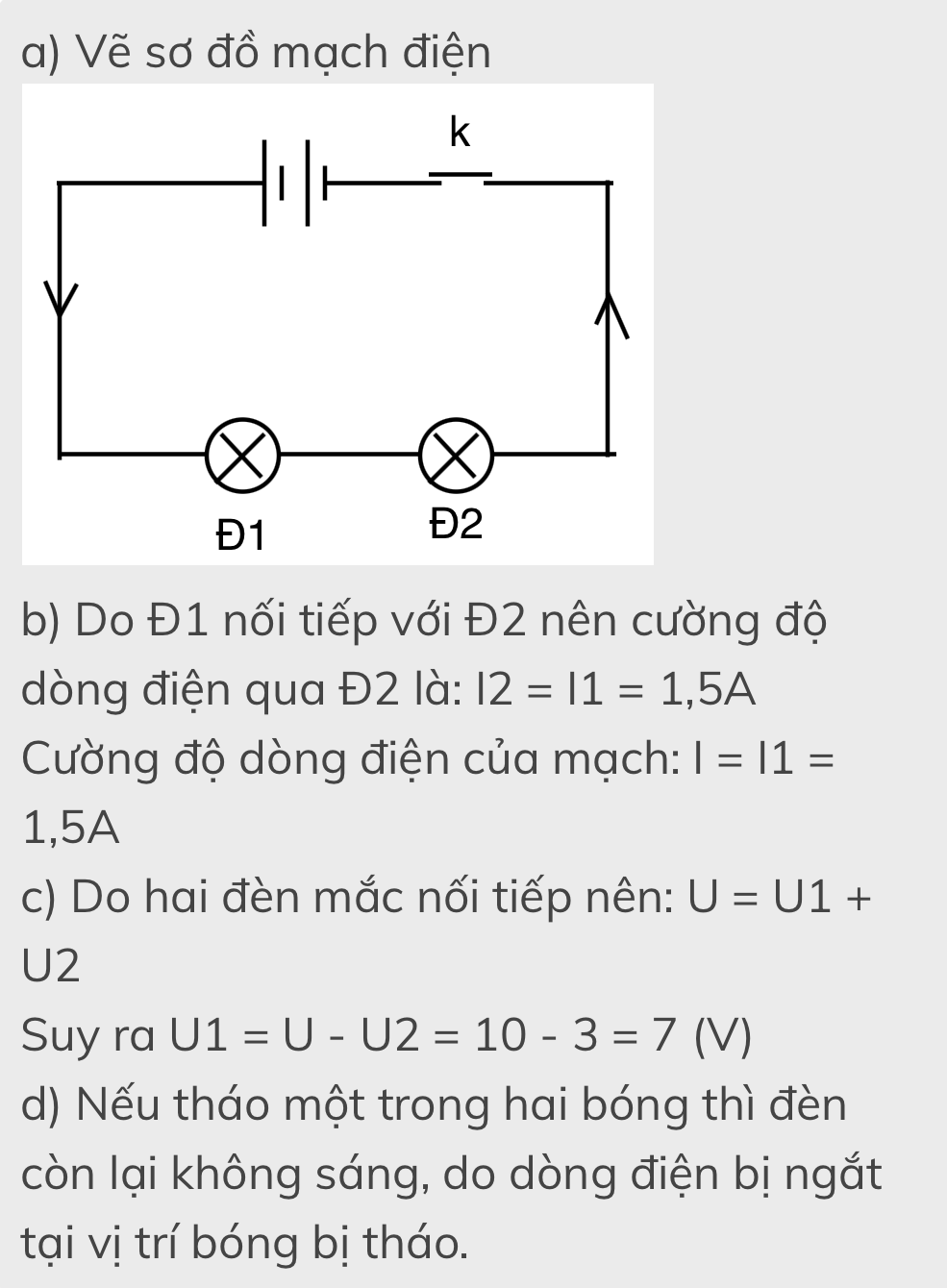 Cho mạch điện gồm: 1 nguồn điện 2 pin nối tiếp; khóa K đóng; 2 đèn Đ1, Đ2 mắc nối tiếp nhau a)Vẽ sơ đò mạch điện? Vẽ chiều dòng điện? ` b)Cho cường độ dòng điện chạy qua đèn Đ1 là I1 =1.5 A .Hỏi cường độ dòng điện qua đèn Đ2 là I2 và I toàn mạch là bao nhiêu? c) Cho hiệu điện thế giữa hai đầu đèn Đ2 là U2=3V, hiệu điện thế toàn mạch Utm=10V.Hỏi hiệu điện thế giữa hai đầu đèn Đ1 là bao nhiêu d)Nếu tháo một trong hai đèn thì đèn còn lại có sáng bình thường ko? Tại sao