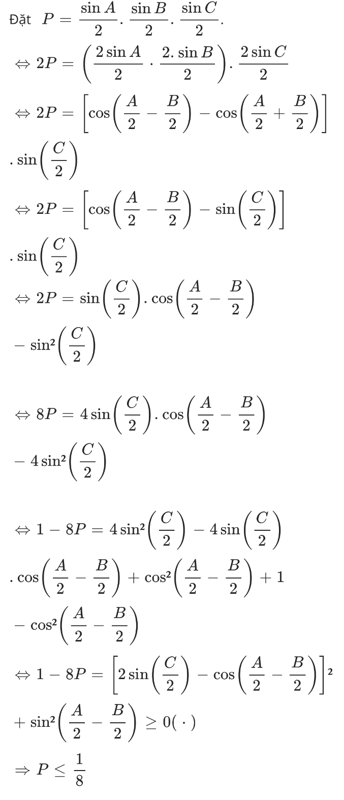 Cho tam giác ABC nhọn. Cmr: a)sin A/2×sinB/2×sinC/2 nhỏ hơn hoặc bằng 1/8