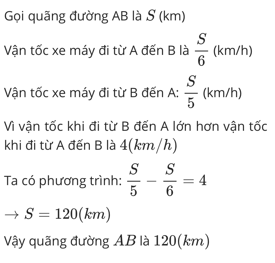 Một người đi xe máy từ a đến b mất 6 giờ.Lúc về người đó đi từ b đến a nhưng mỗi giờ đi nhanh hơn 4km nên chỉ mất 5 giờ .Tính độ dài quãng đường ab