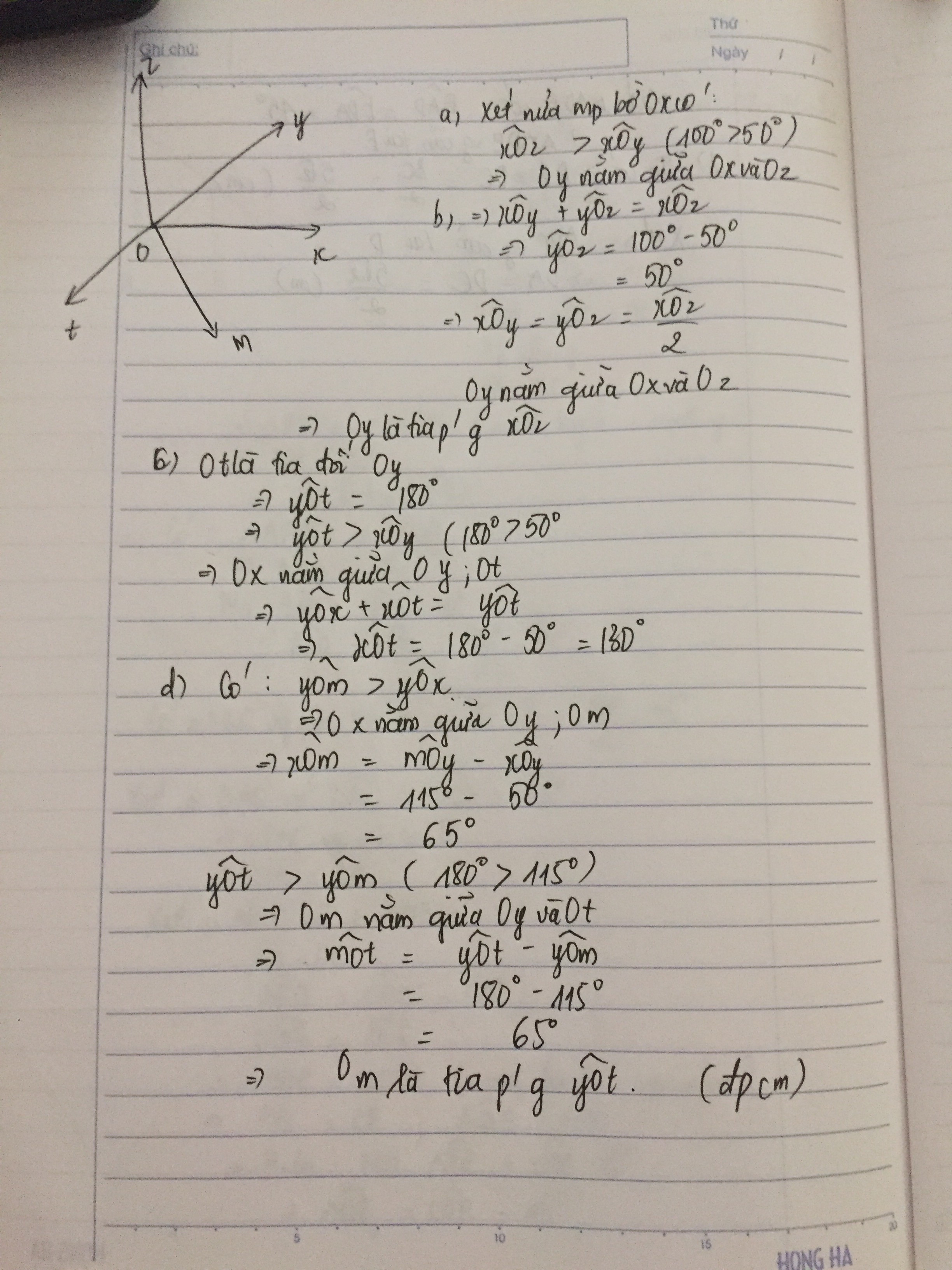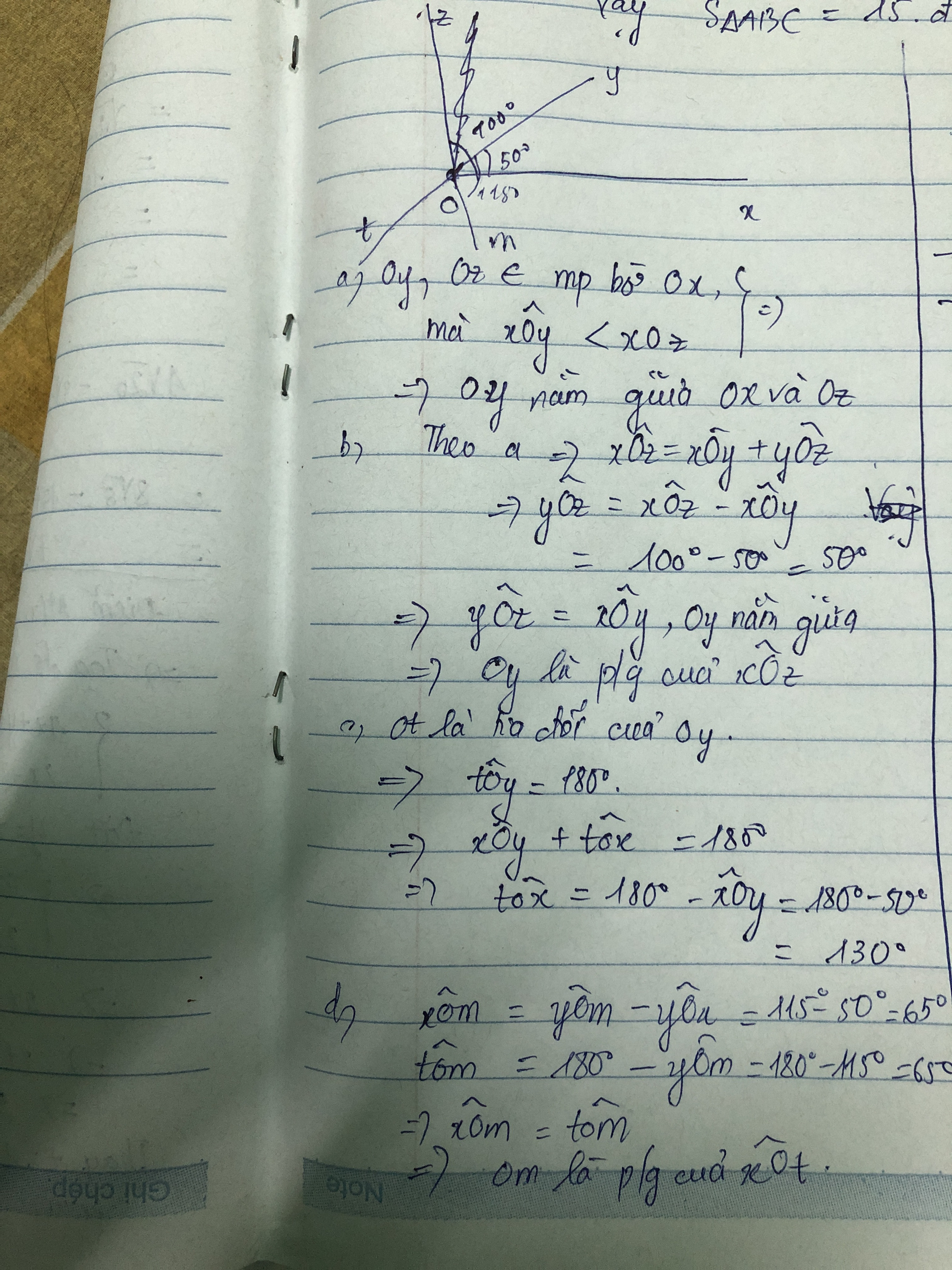 Bài 6: Trên nửa mặt phẳng chứa tia Ox vẽ xÔy =50xÔz =100. a) Trong ba tia Ox, Oy, Oz, tia nào năm giữa hai tia còn lại? Vì sao b) Tia Oy có phải là tia phân giác của góc xÔz không? Vì sao? c) gọi Ot là tia đối của tia Oy. Tinh tÔX? d) Trên nửa mặt phẳng chứa tia Oy chứa tia Ox, vẽ yOm 115. Chứng minh Om là tia phân giác của góc xOt.