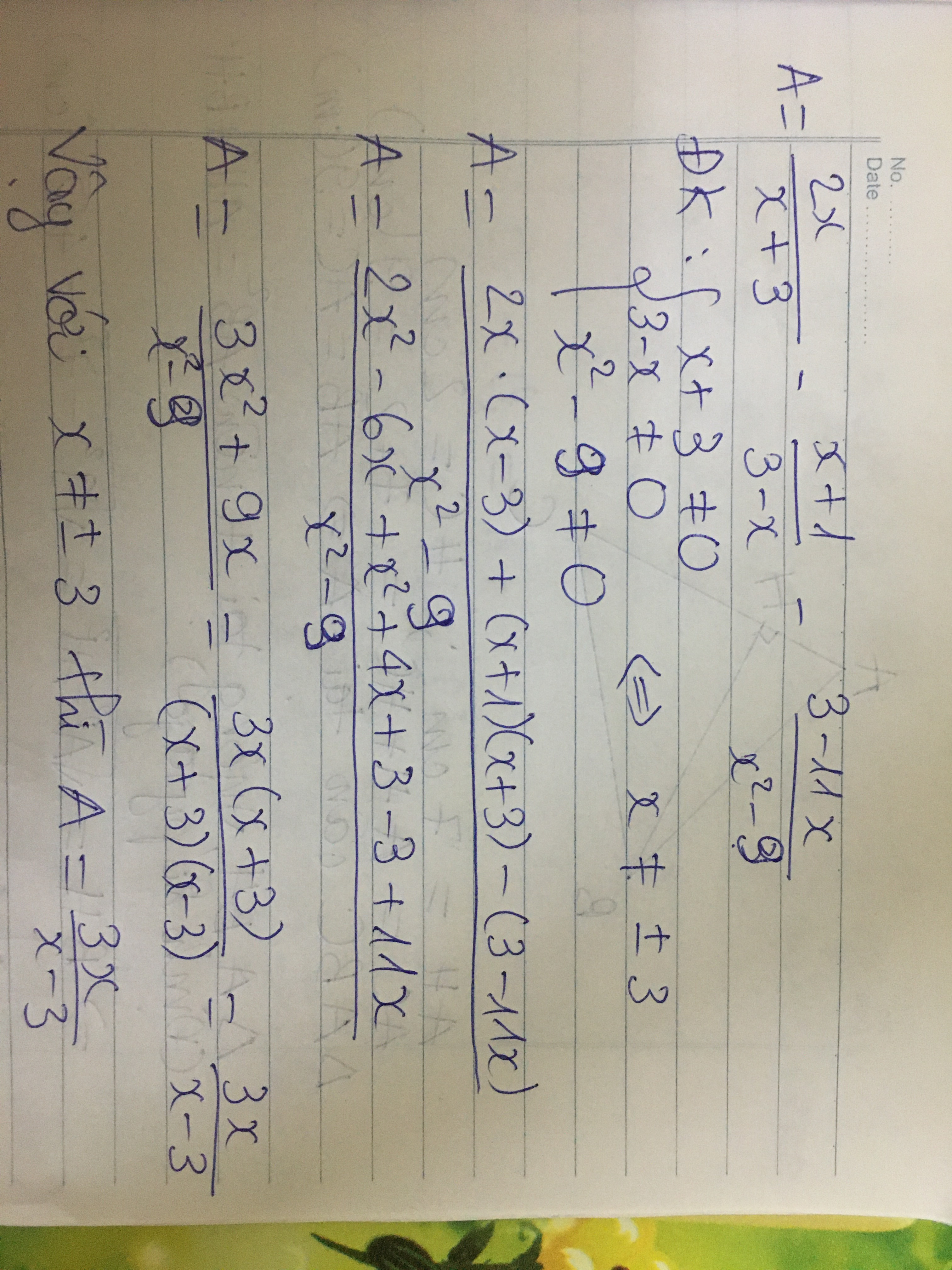 = \frac{{3{x^2} + 9x}}{{(x - 3)(x + 3)}}\\