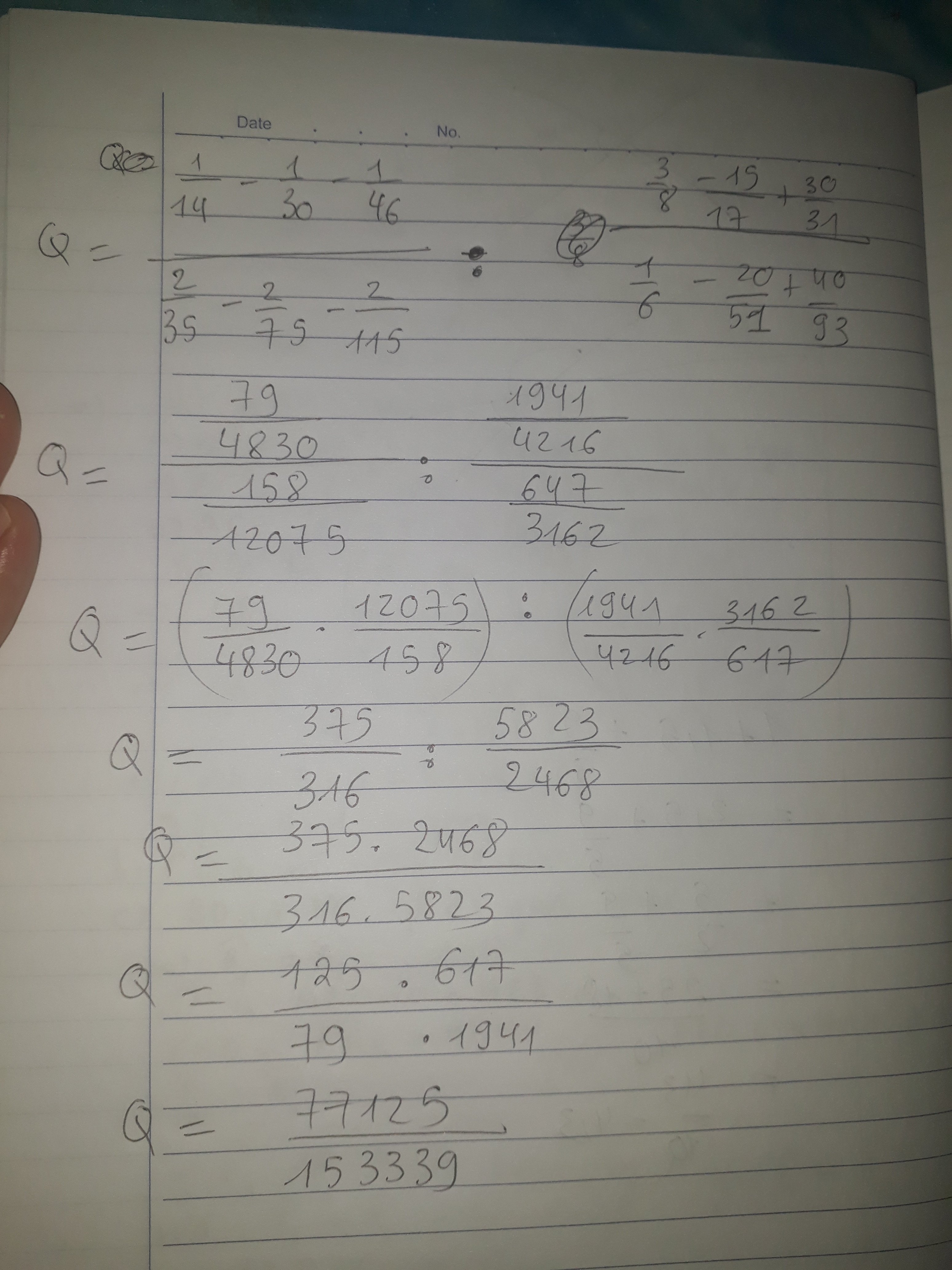 Q = 1/14 -1/30 - 1/46 / 2/35 - 2/75 - 2/115 : 3/8 - 15/17 + 30/31 / 1/6 - 20/51 + 40/93.