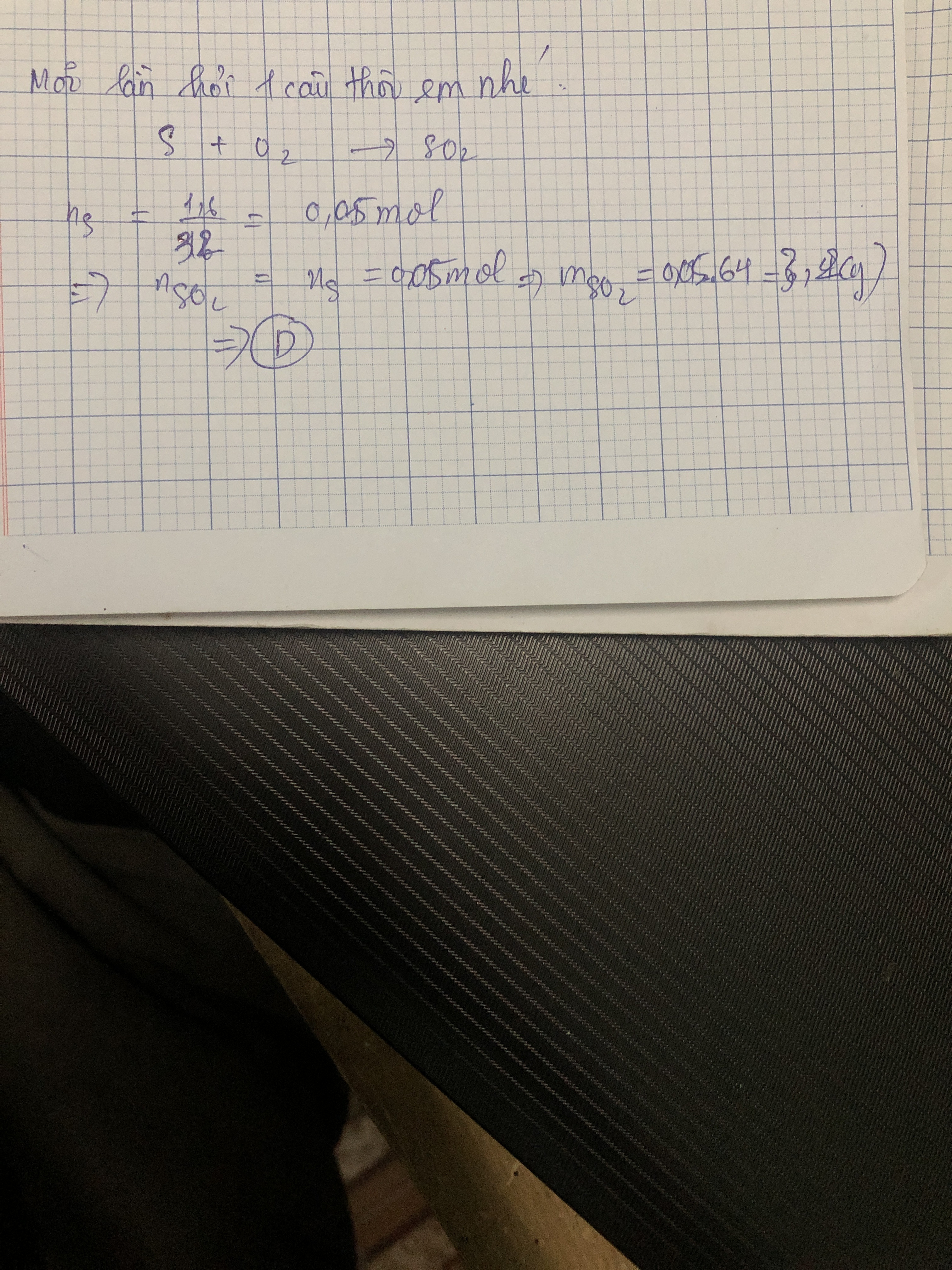 Theo PTHH nSO2=nS=0,05 mol