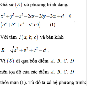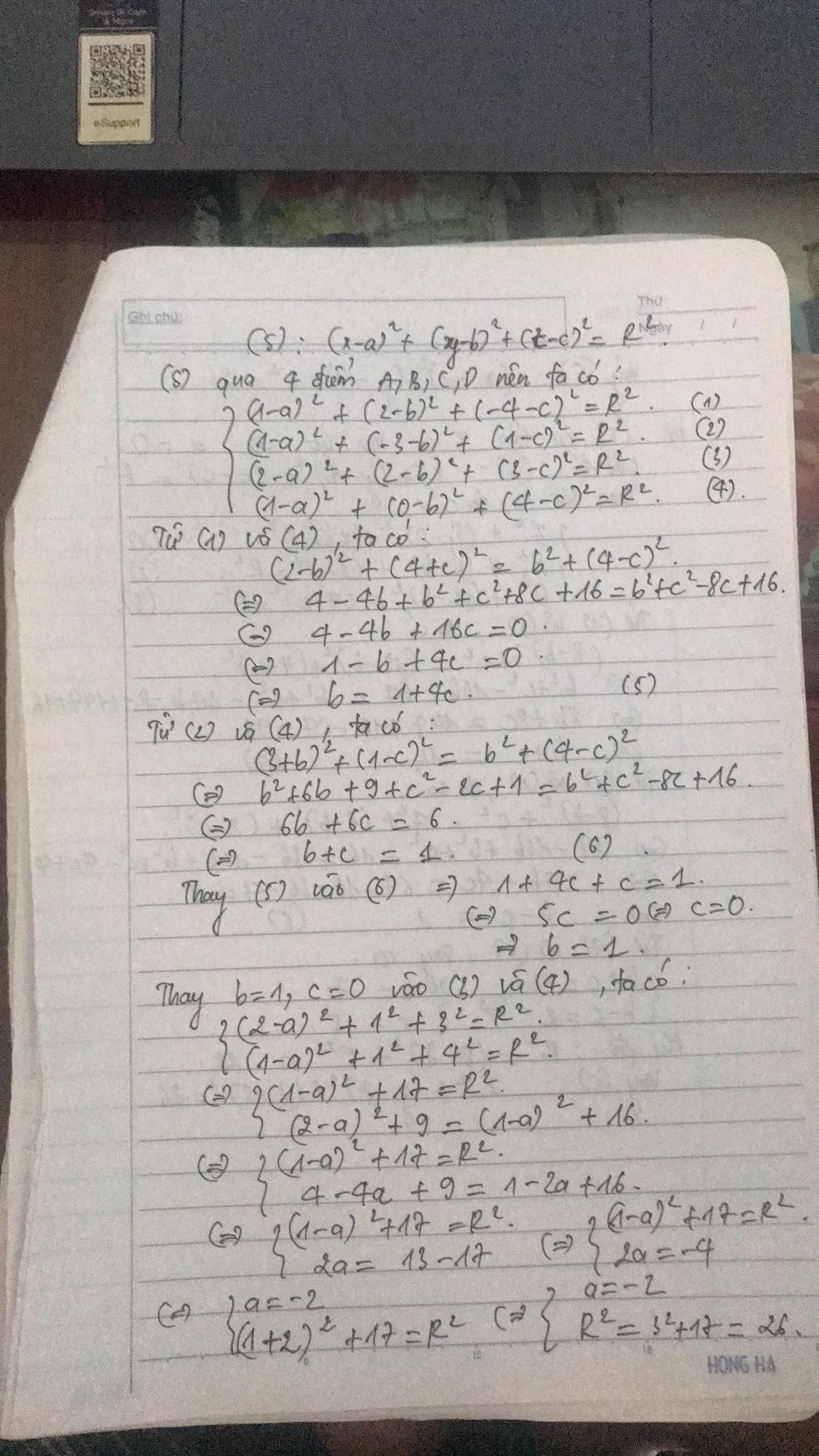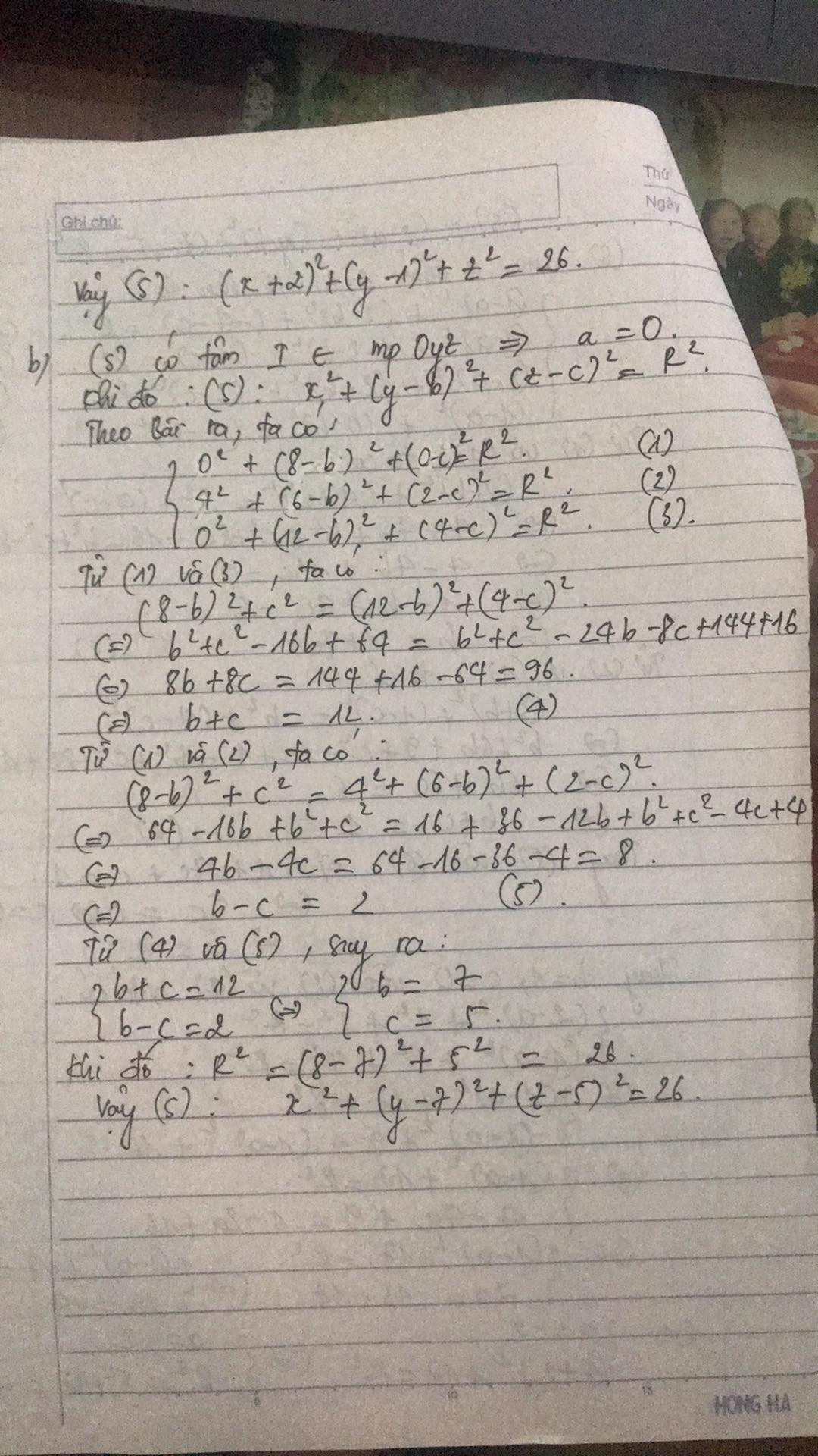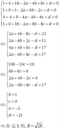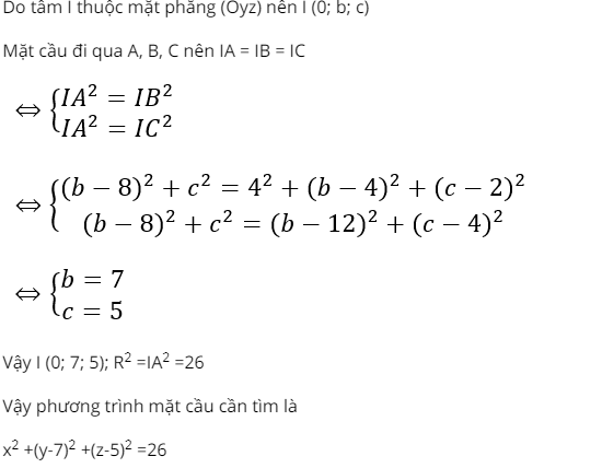 Viết phương trình mặt cầu(S) biết: a) (S) qua bốn điểm A(1;2;-4) B(1;-3;1) C(2;2;3) D(1;0;4) b) (S) qua A(0;8;0) B(4;6;2) C(0;12;4) và có tâm I thuộc mp (oyz)