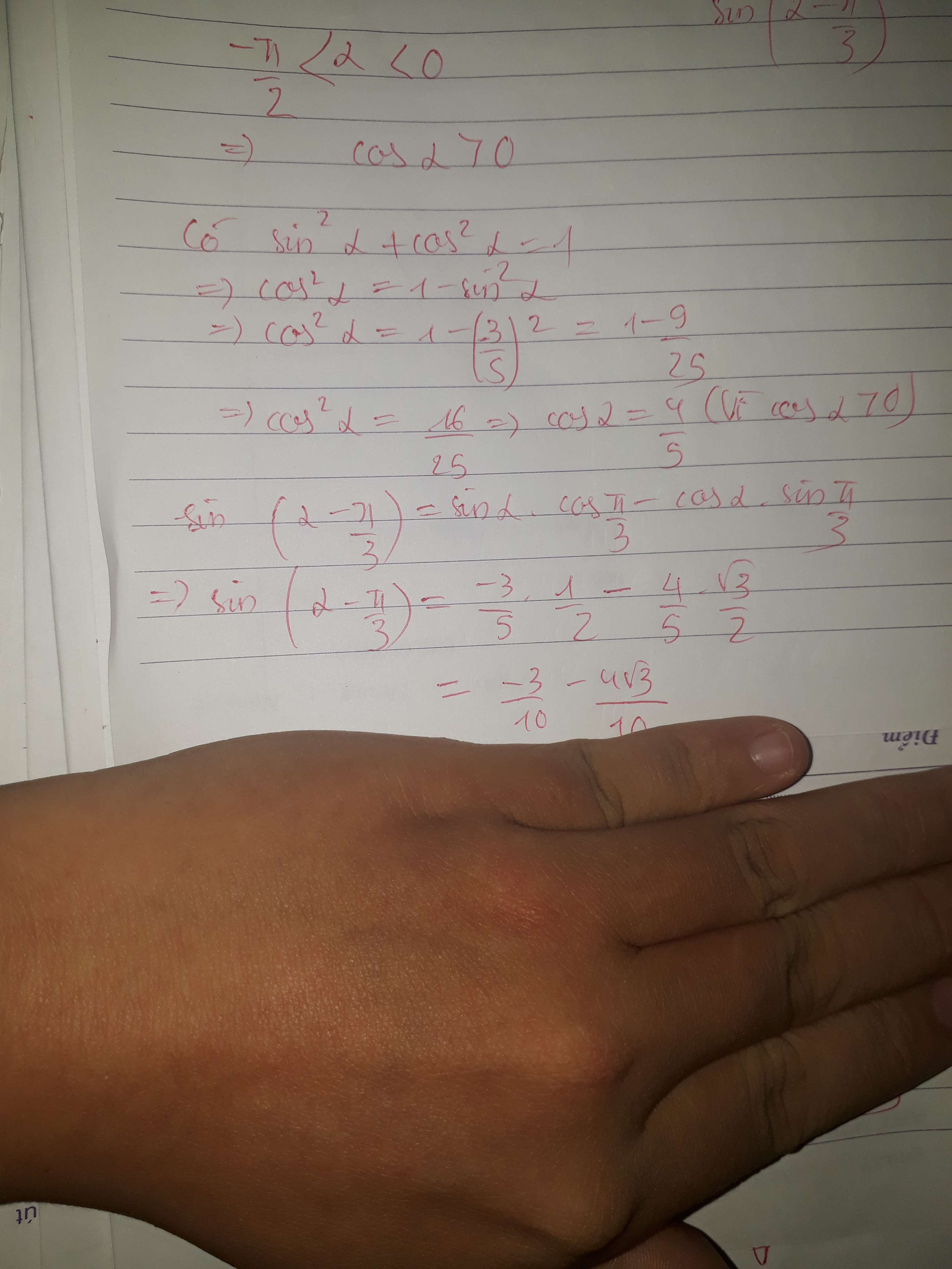 Cho sina=-3/5 với -pi/2<a<0. Tính giá trị lượng giác cosa, sin(a-pi/3)