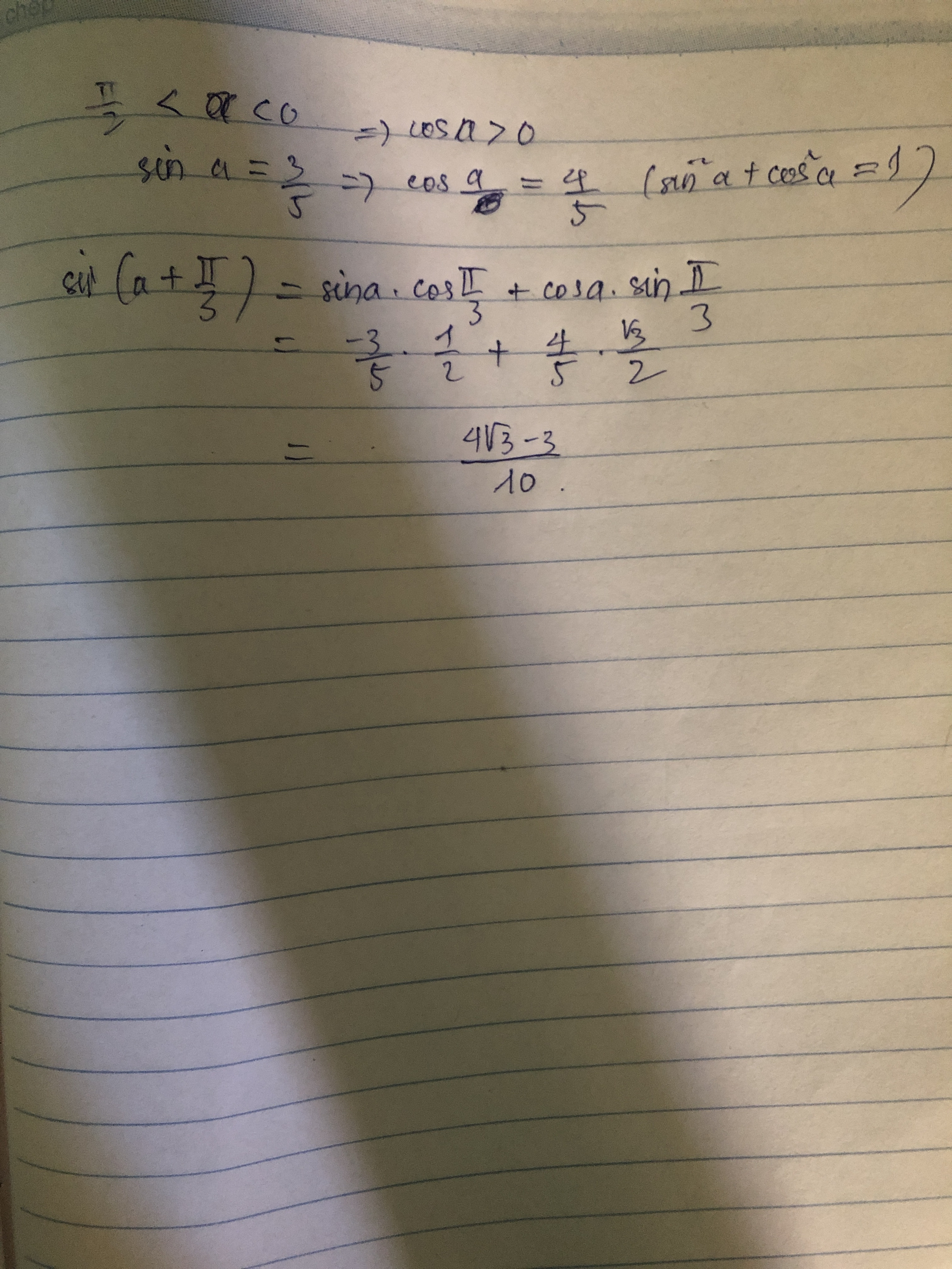 Vì π<a<3π2 nên cosa<0Từ đẳng thức: sin2a+cos2a=1⇔cos2a=1−sin2a⇔cosa=−1−sin2a−−−−−−−−√=−1−(−35)2−−−−−−−−−√=−45Áp dụng công thức cộng:sin(a+π3)=sina.cos(π3)+cosa.sin(π3)=−35.12+−45.3√2=−3−43√10