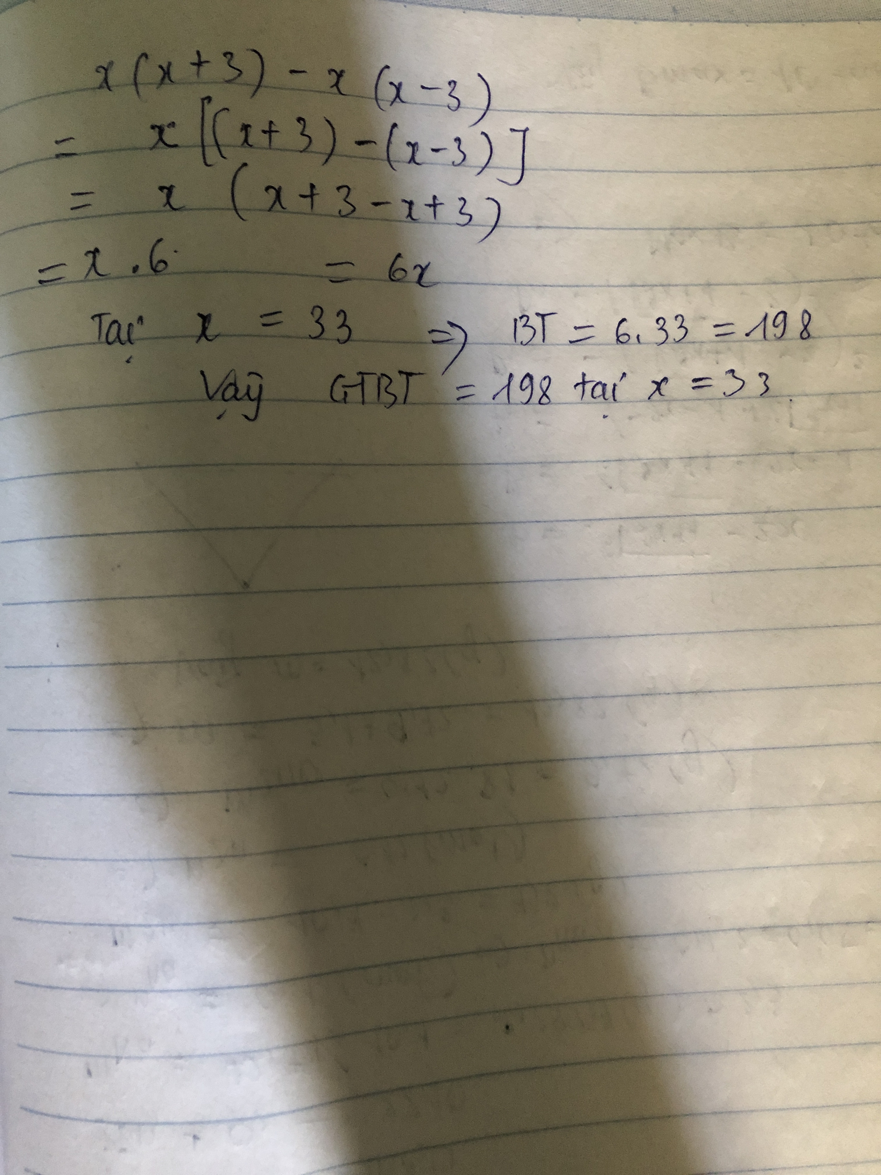x.(x+3)-x.(x-3) Tại x=33