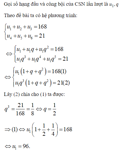 Tìm số hạng đầu u1 của cấp số nhân un biết rằng u1+u2+u3=168 và u4+u5+u6=21.A. u1=24B. u1=134411C. u1=96D. u1=2173