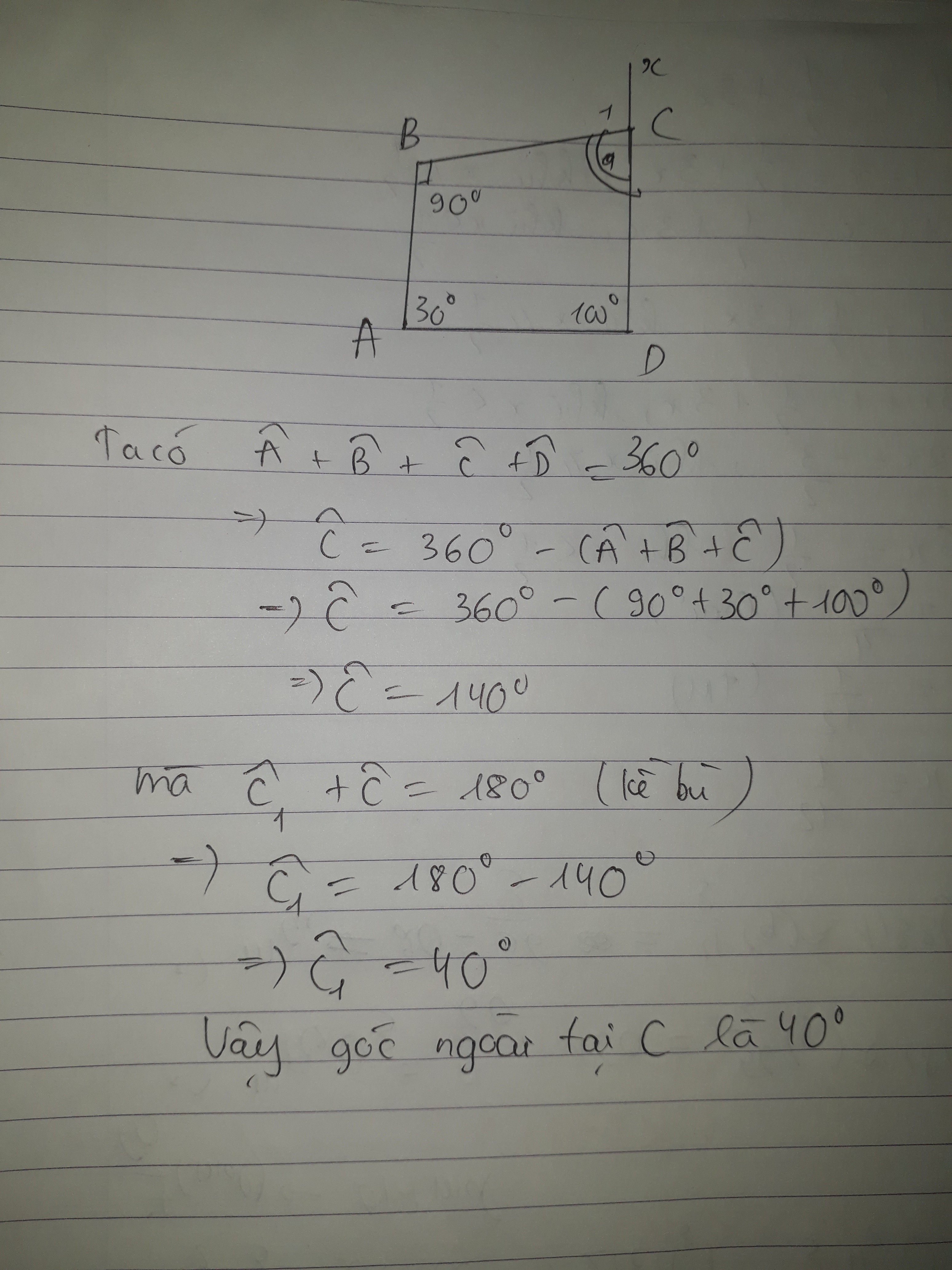 Cho tứ giác ABCD có góc A=30°, B=90°, D=100°,và góc ngoài tại C của tứ giác ABCD