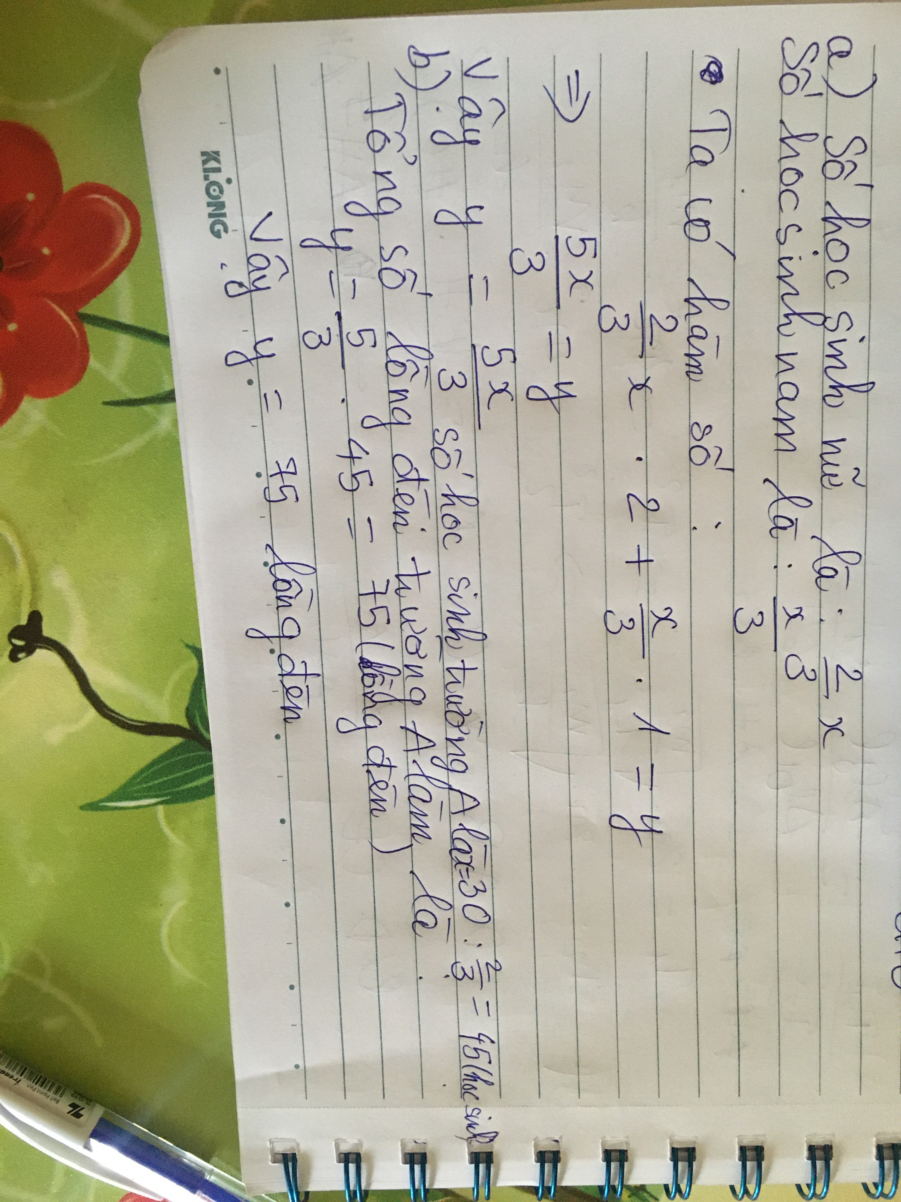 b, 2/3x=30 vậy số học sinh trường A là 45 học sinh trong đó có 30 học sinh nữ 15 học sinh nam
