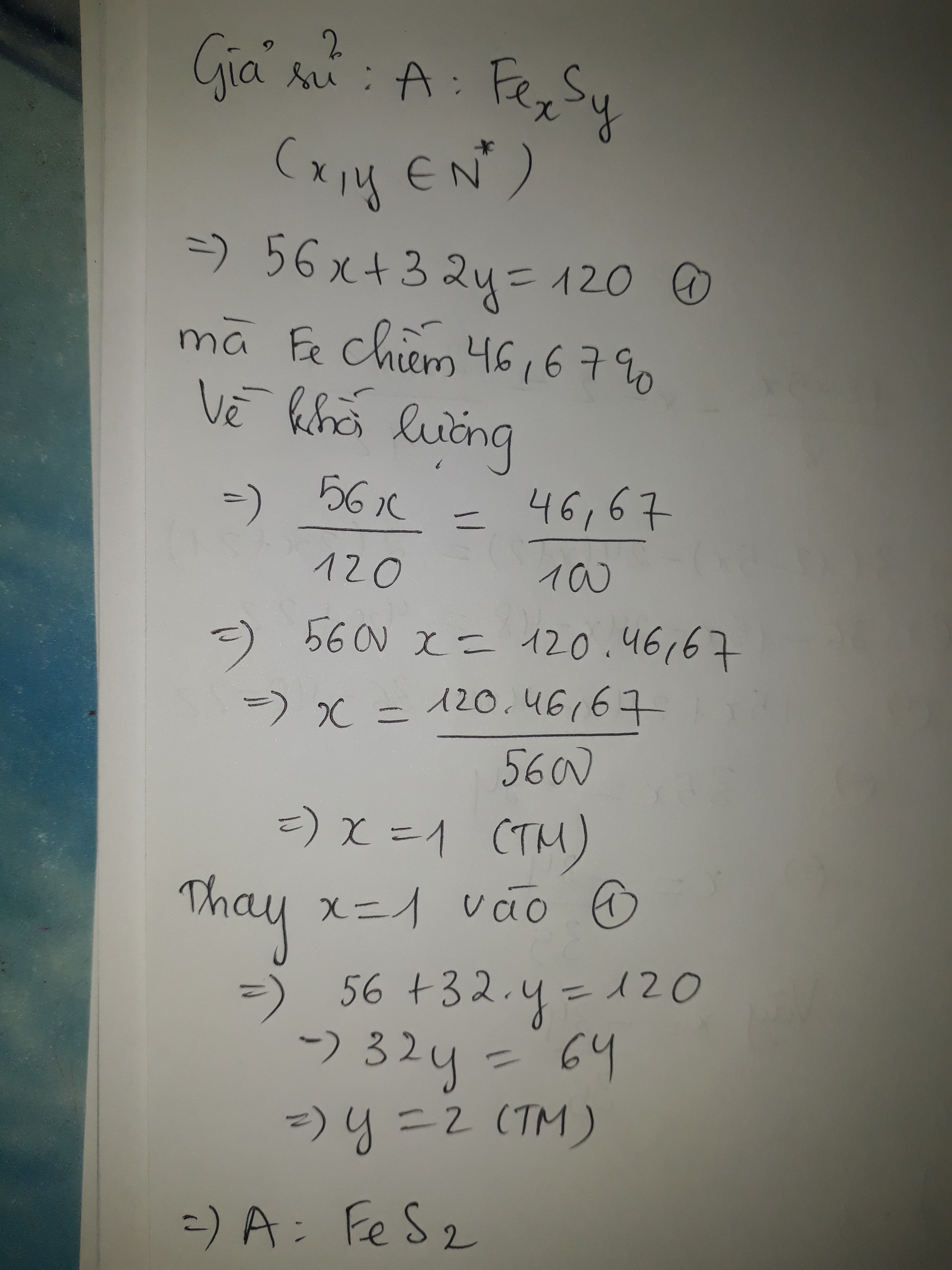 Bài 4. Hợp chất A tạo bởi 2 nguyên tố Fe và S. Biết trong A, Fe chiếm 46,67% về khối lượng, khối lượng mol của A bằng 120 g/mol. Xác định công thức hóa học của A.