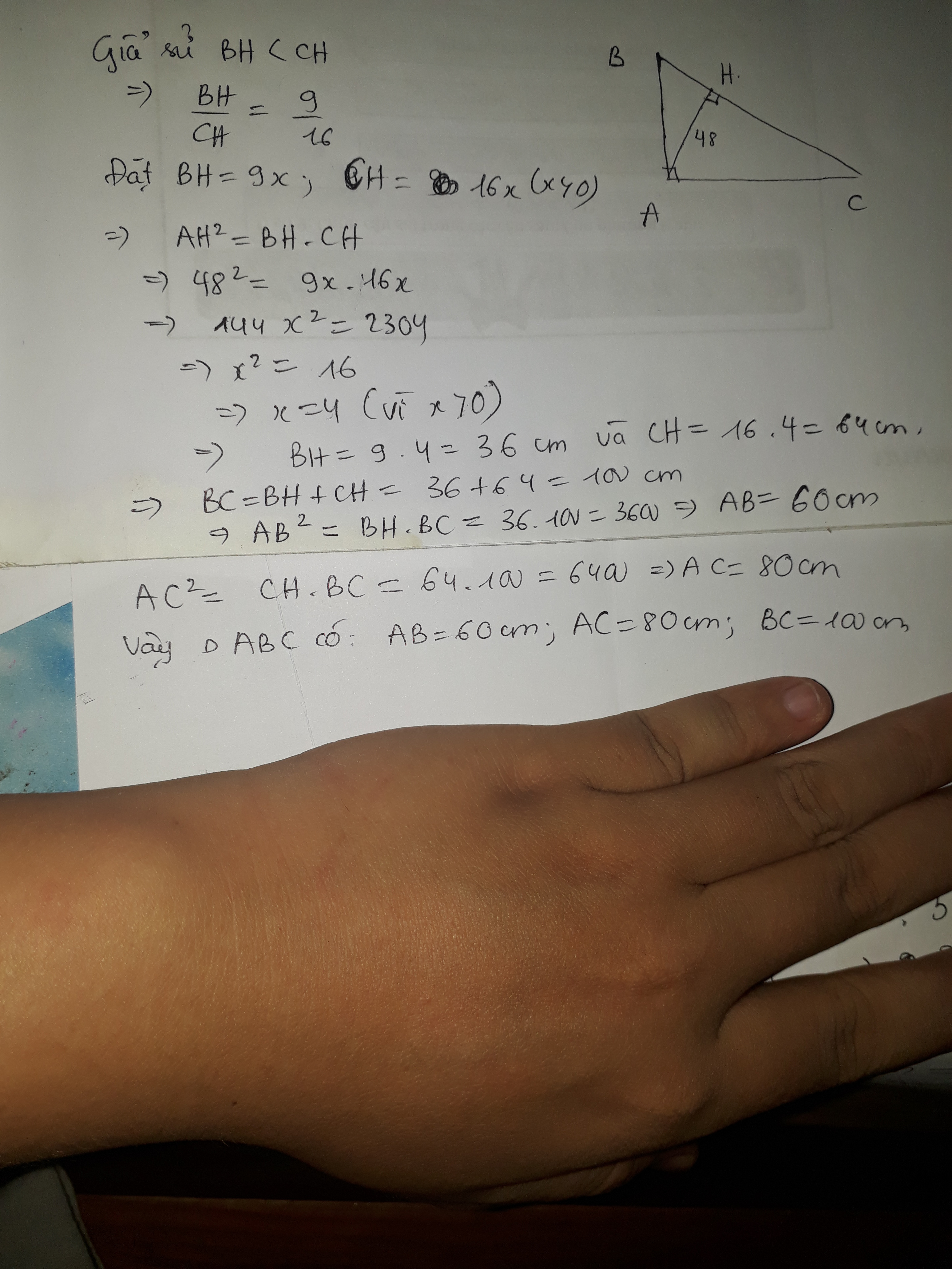 Tính độ dài các cạnh của tam giác vuông biết đường cao ứng với cạnh huyền có độ dài 48 cm và hình chiếu của các cạnh góc vuông trên cạnh huyền tỉ lệ với 9/16