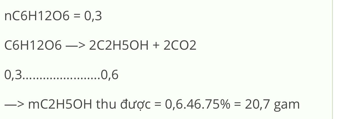 mC2H5OH thực tế = mC2H5OH lí thuyết×%H : 100% = 27,6×75%:100% = 20,7 (g)