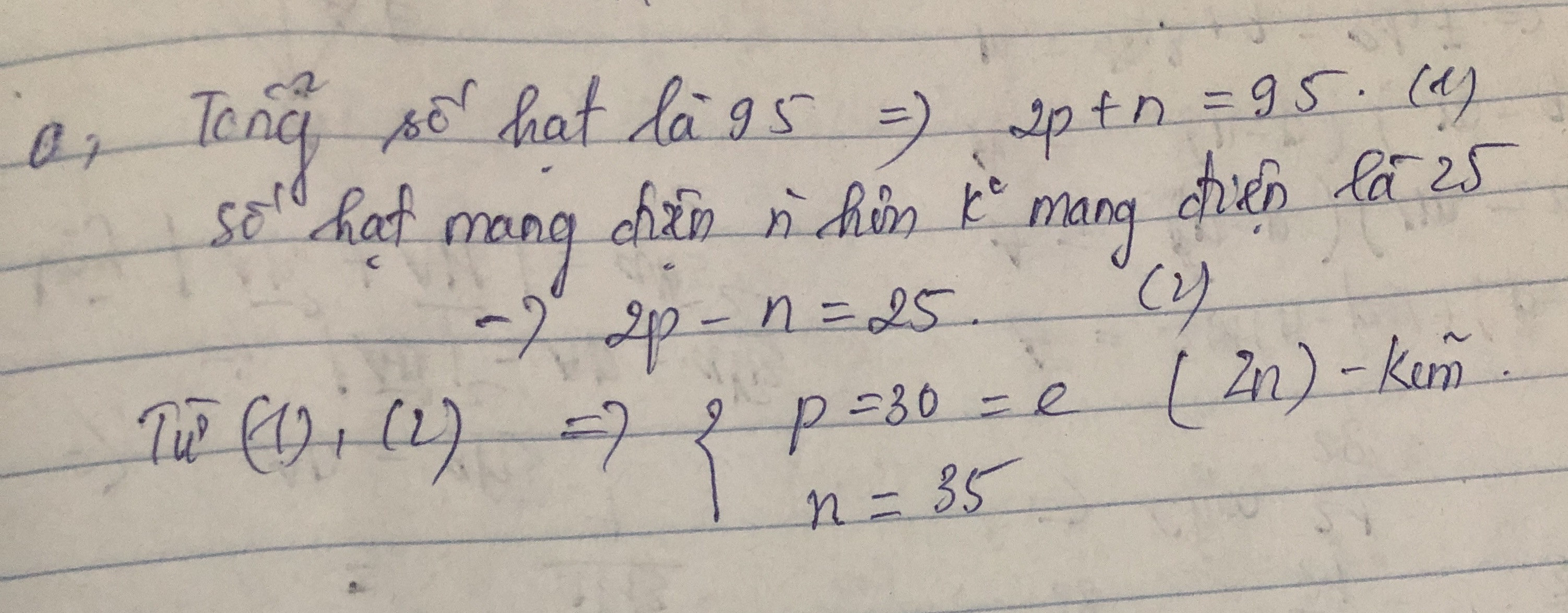 b. Tương tự theo đề ra ta có : e+p+n =36 và e+p =2.n <=> 2p+n=36 và 2p =2n ( do e=p)