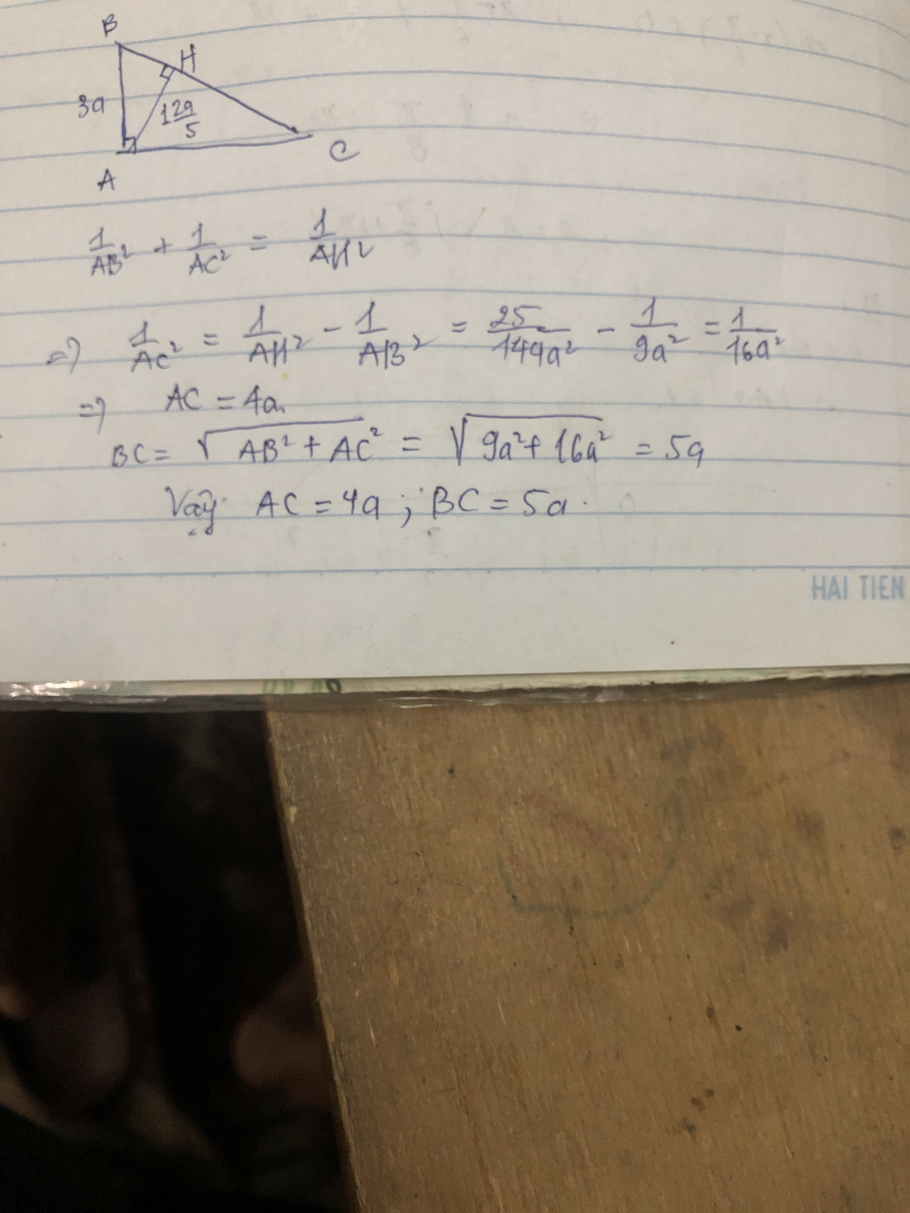 Cho tam giác ABC vuông tại A có đường cao AH ( H thuộc BC ). Biết AB = 3a, AH = 12a/5. Tính a theo độ dài AC và BC
