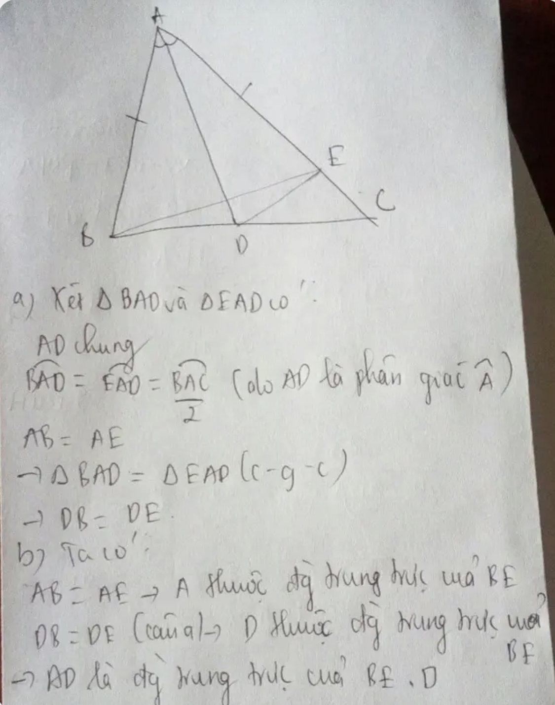 Cho tam giác ABC, đường phân giác AD. Trên tia AC lấy điểm E Sao cho AE=AB. Chứng minh: