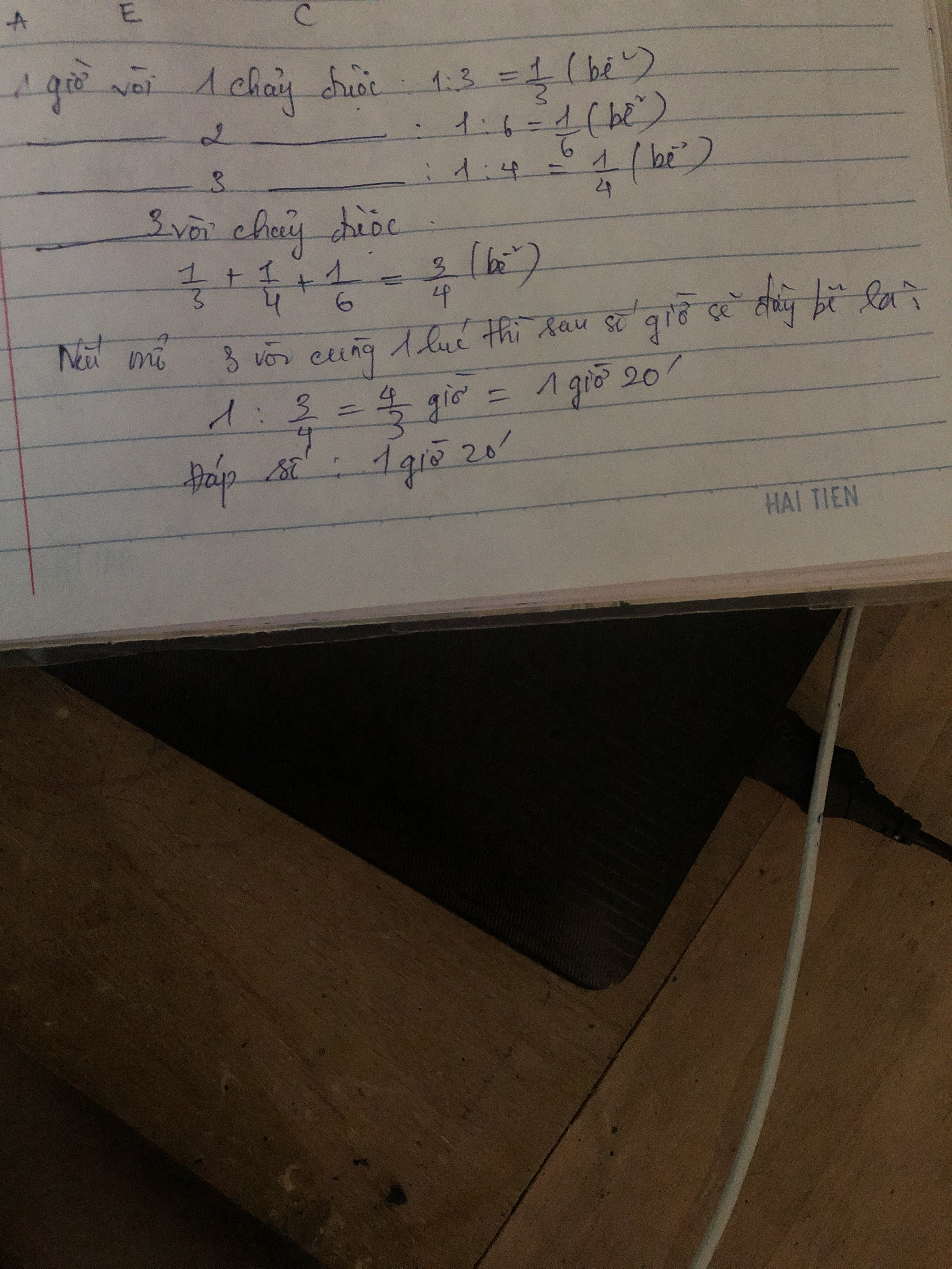 Bài 2. Ba vòi nước cùng chảy vào một cái bể không có nước. Một mình vòi thứ nhất chảy sau 3 giờ bể sẽ đầy. Một mình vòi thứ hai chảy sau 6 giờ bể sẽ đầy. Một mình vòi thứ ba chảy sau 4 giờ bể sẽ đầy. Bể đã có sẵn - bể nước. Hỏi nếu mở cả ba vòi cùng lúc thì sau bao lâu bể sẽ đầy?
