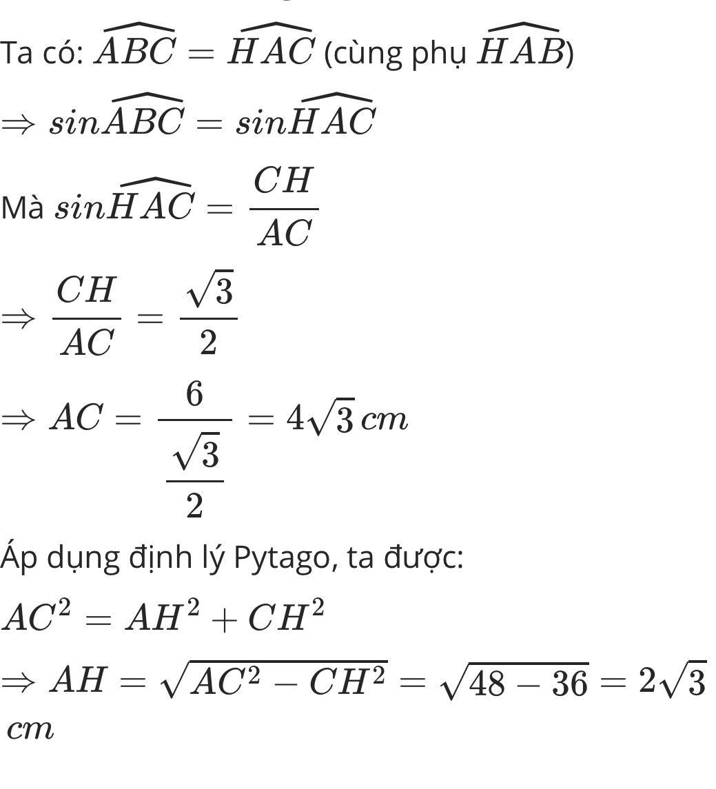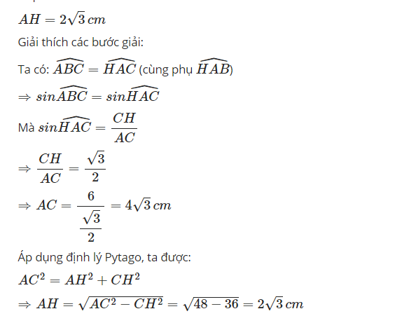 Cho tam giác ABC vuông tại A duong cao AH Biết CH =6 và SinB =√3/2 thì độ dài của AH là bao nhiêu
