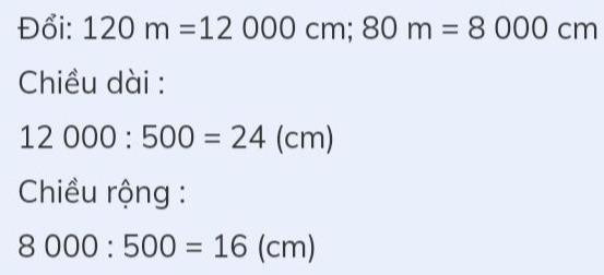 Đổi 120m=12 000 cm; 80m=8 000 cm Chiều dài trên bản đồ là: